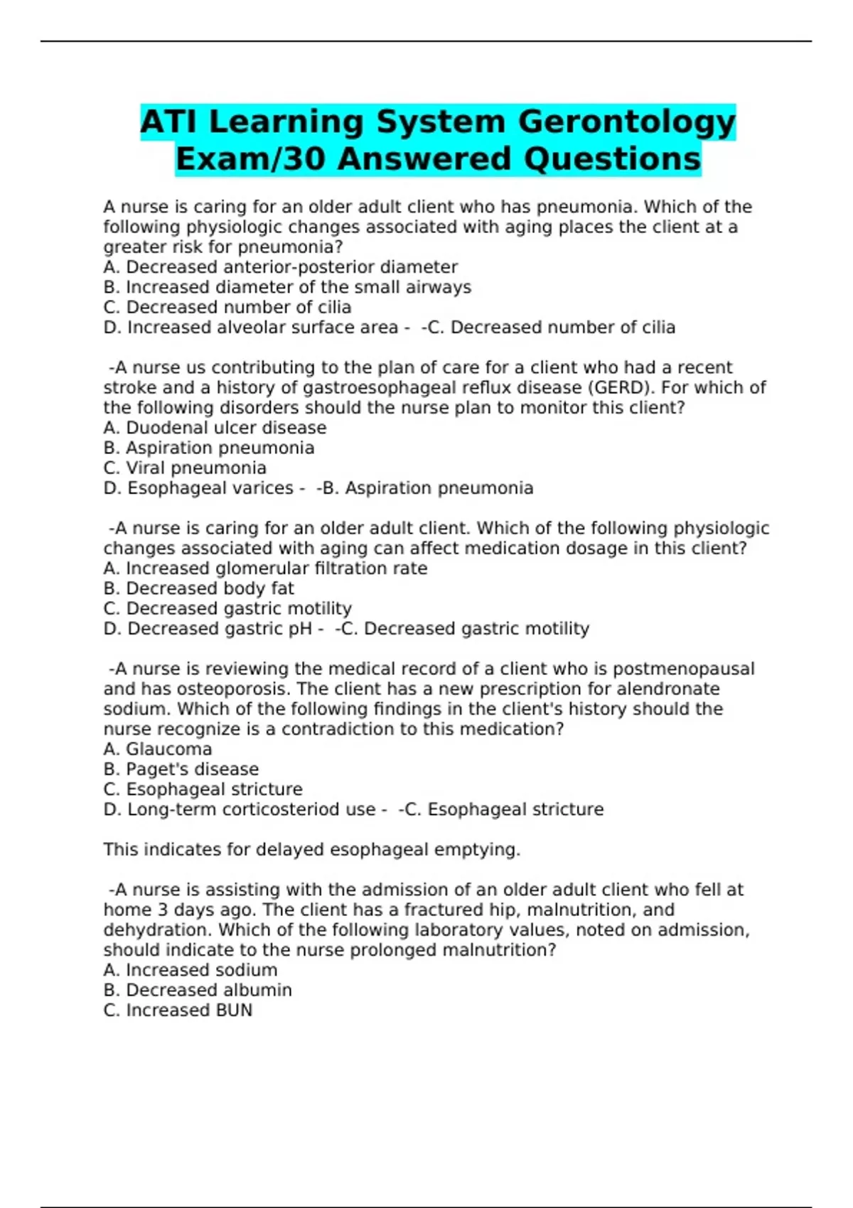 ATI Learning System Gerontology Exam/30 Answered Questions