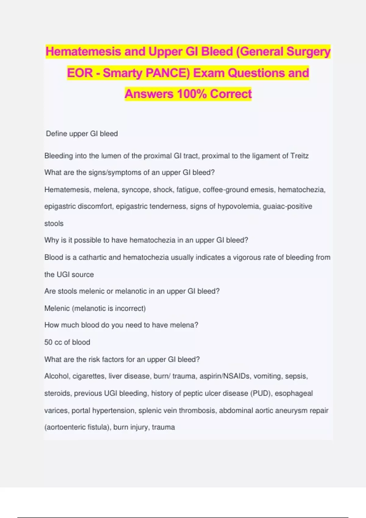 Hematemesis and Upper GI Bleed (General Surgery EOR - Smarty PANCE) Exam Questions and Answers 100% Correct