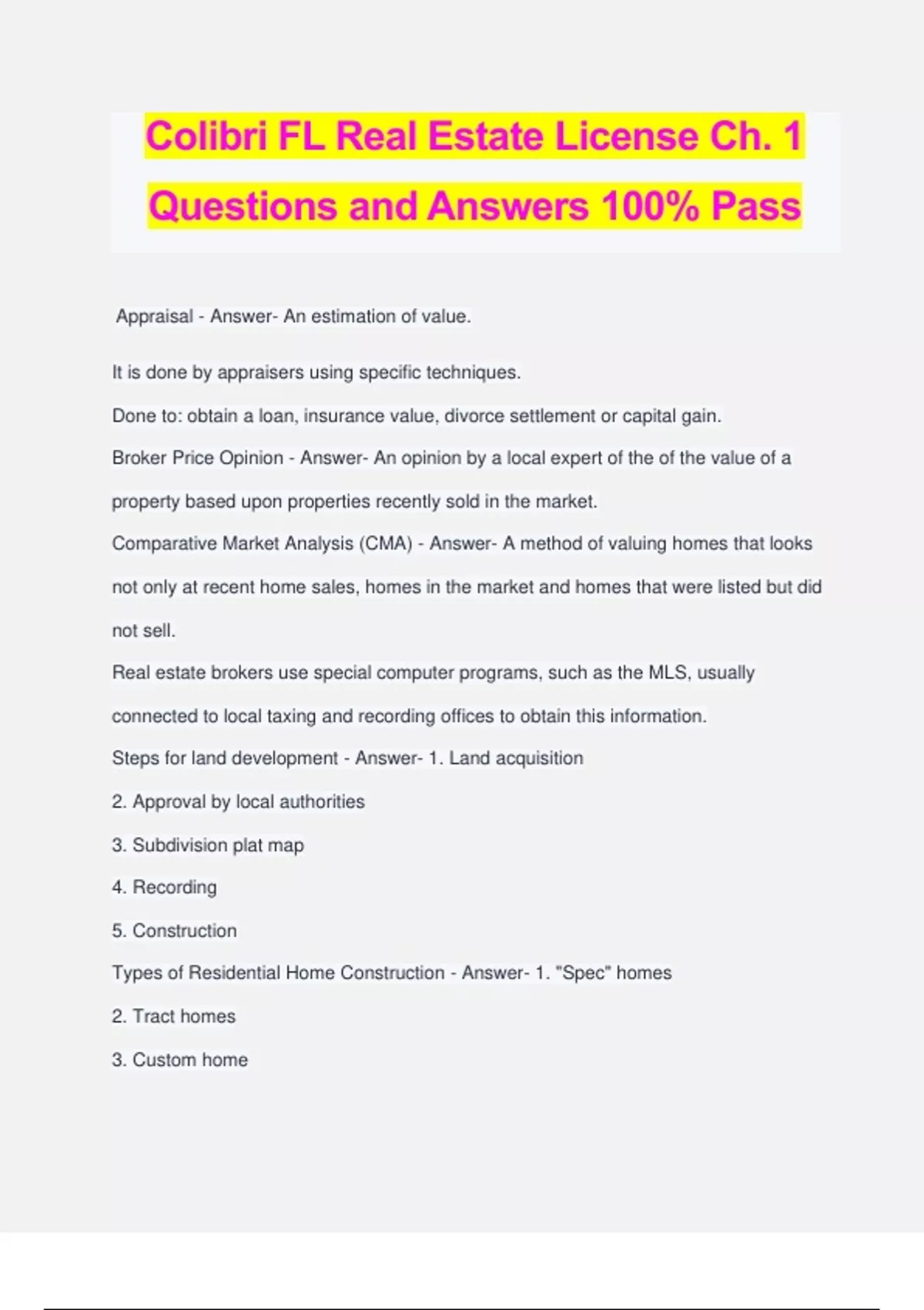 Colibri FL Real Estate License Ch. 1 Questions and Answers 100% Pass