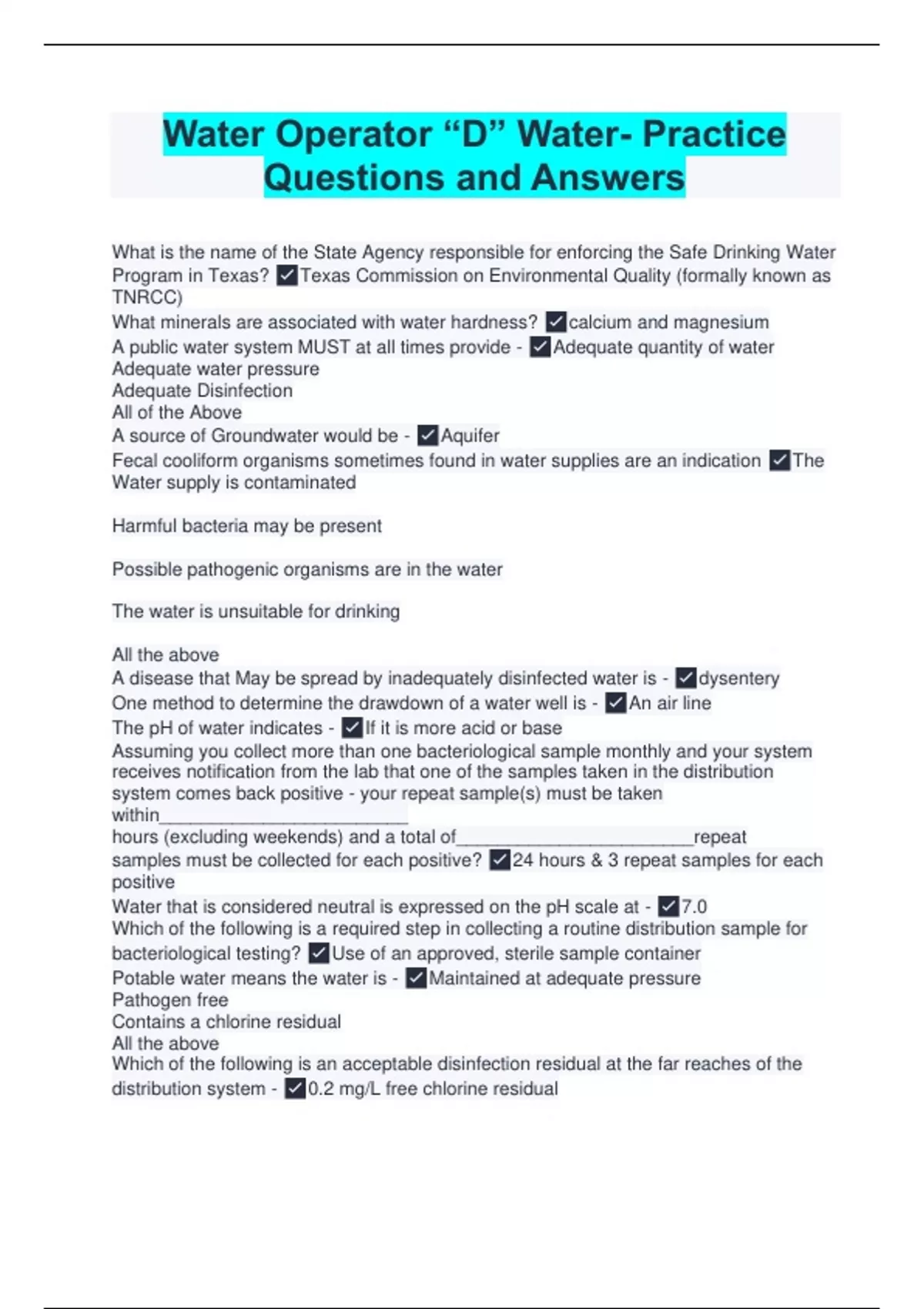 Dive into success with our Texas Class D Water License Q&A Exam Bundle, meticulously tailored to guide you towards certification excellence. Explore a comprehensive array of questions and detailed answers, meticulously crafted to fortify your understanding of water treatment principles and regulatory compliance specific to Texas.