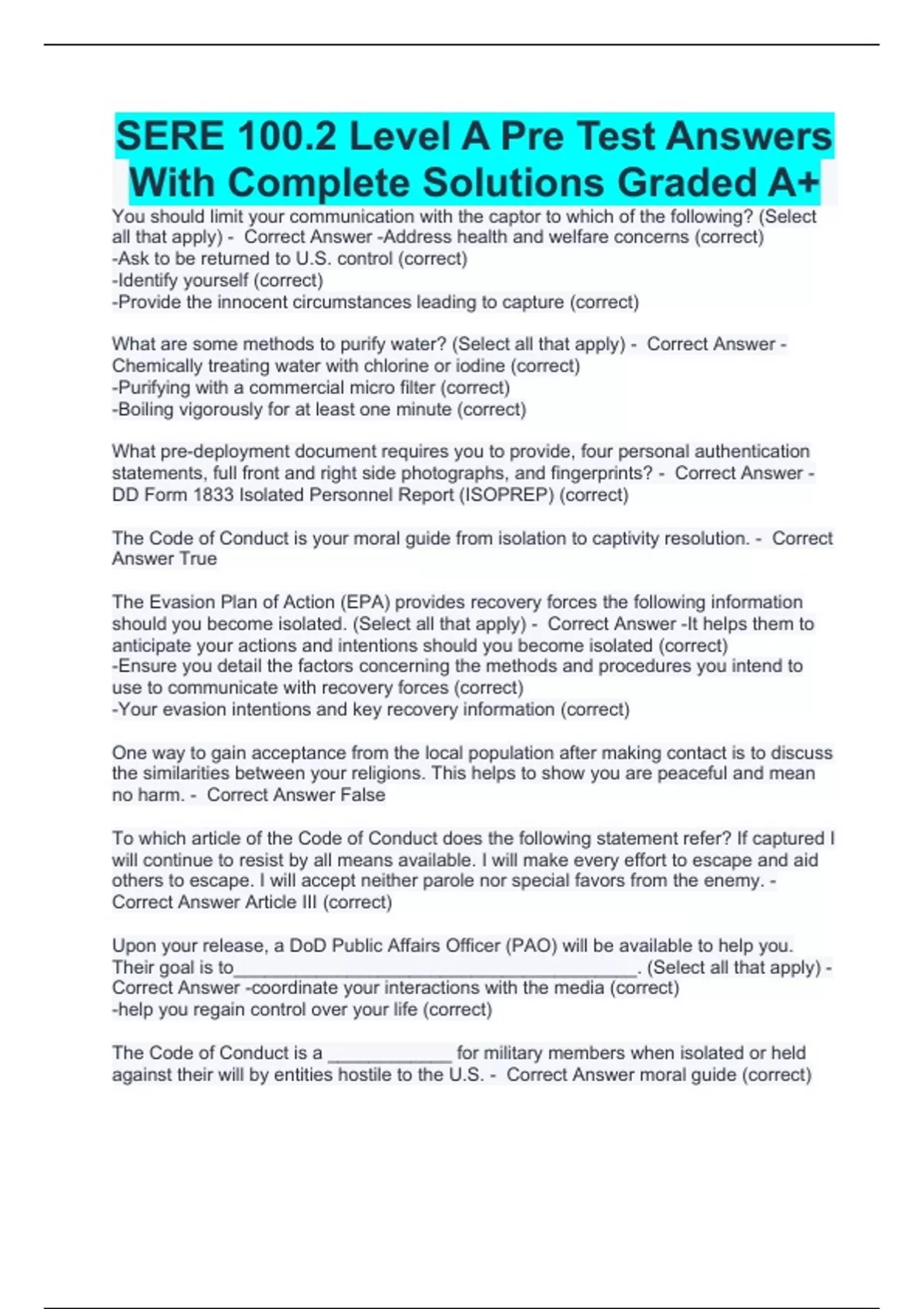 SERE 100.2 Level A (Civilian) Questions With 100% Correct Answer/Sere 100.2 Post Test 100% questions with complete solutions/A-US1329 SERE 100.2 Level A Military Pre-test Exam With Complete Solutions/SERE 100.2 Level A Pre Test Answers With Complete Solutions Graded A+