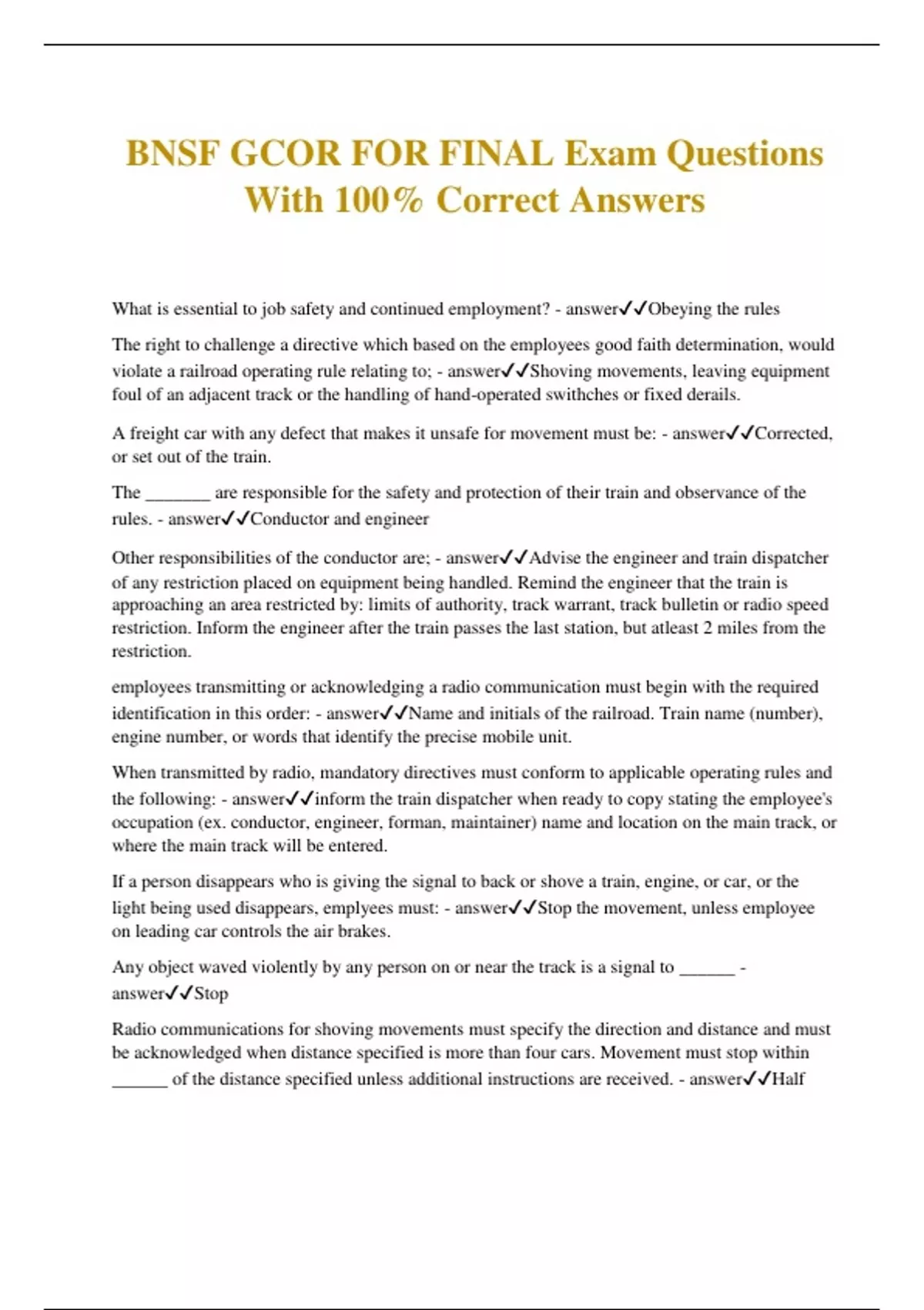 BNSF GCOR FOR FINAL Exam Questions With 100% Correct Answers