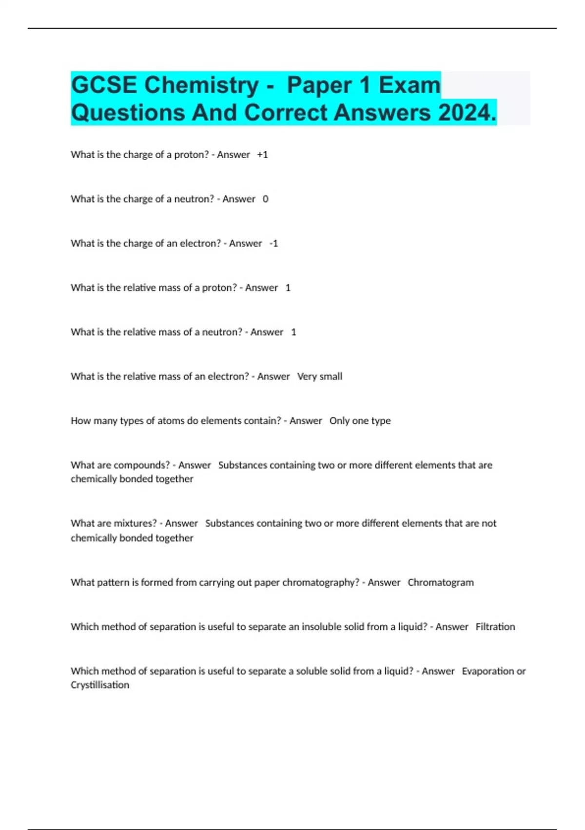 1 Exam (elaborations) GCSE Chemistry C8 Study Guide Exam And Complete Answers 2024. 2 Exam (elaborations) GCSE Chemistry C8 Study Guide Exam And Complete Answers 2024. 3 Exam (elaborations) GCSE AQA Chemistry Topic 9- Chemistry of the Atmosphere Test Questions Well Answered 100% 2024. 4 Exam (elaborations) Topic 6 Chemistry Gcse Practice Exam Fu