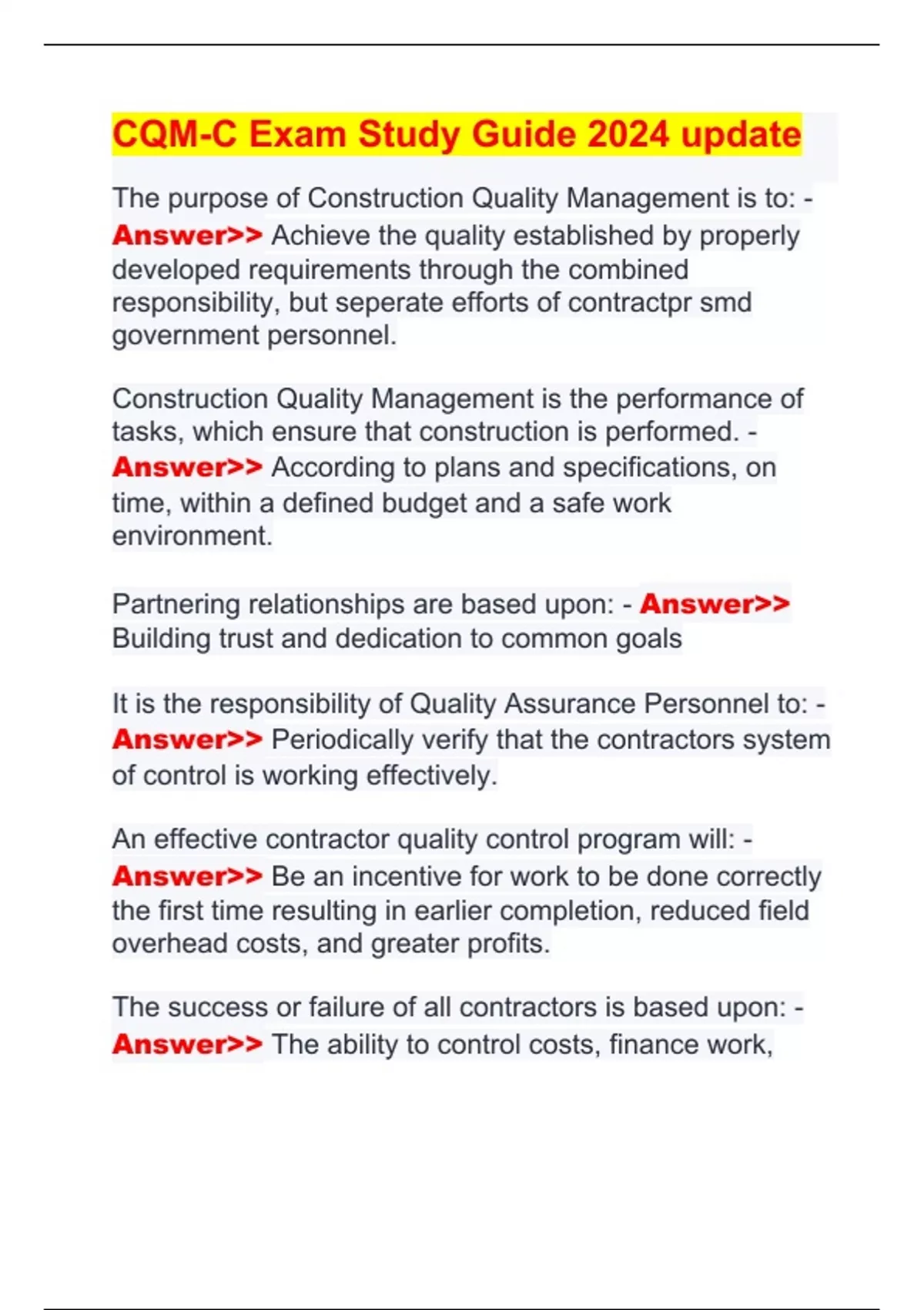 CQM CONSTRUCTION QUALITY MANAGEMENT EXAM PREPARATIONs COMPILATION BUNDLE