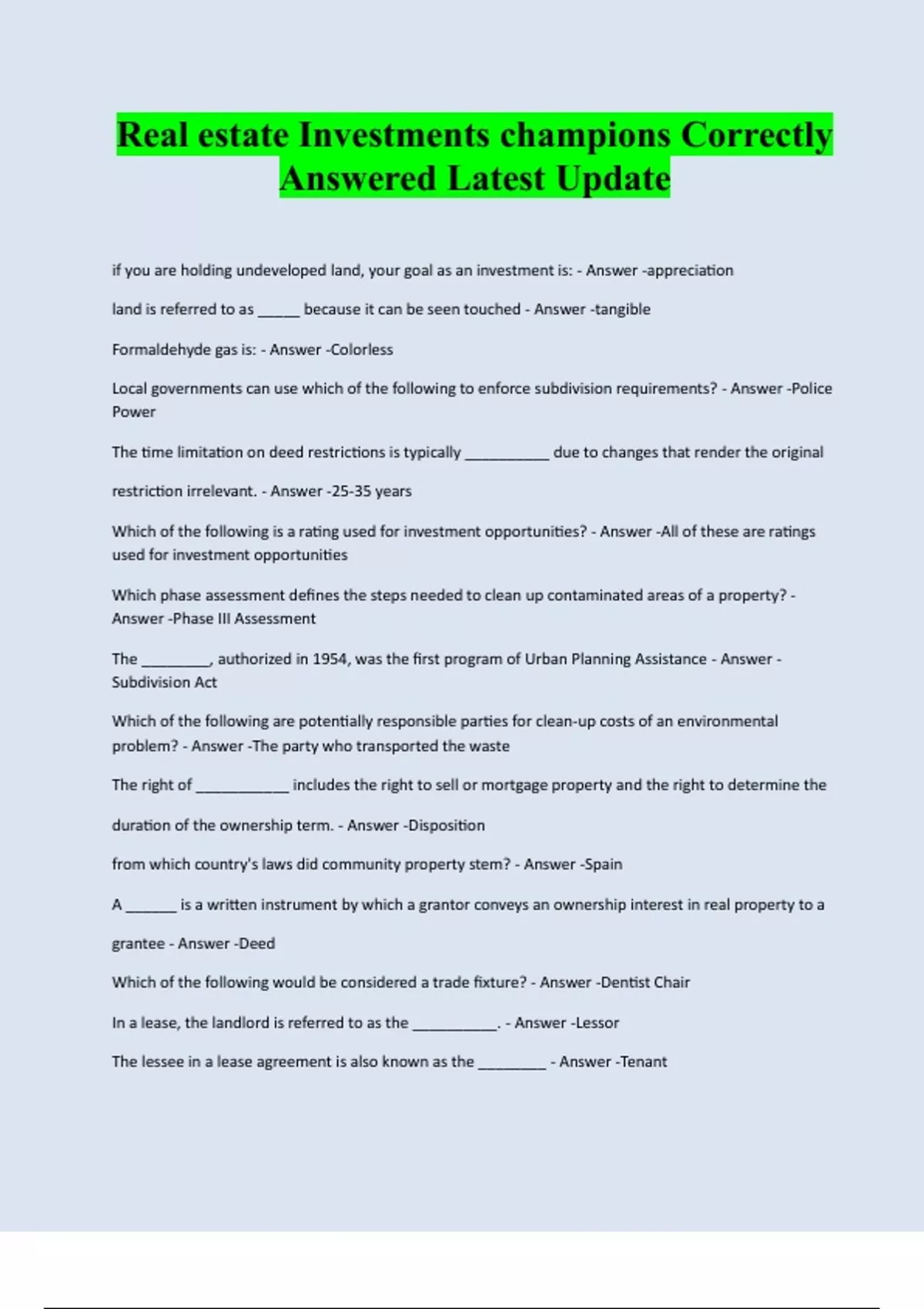 Bundle for Principles of Real Estate finance correctly Solved 2024 | 2025 (Champions School of Real Estate). Actual tests, SAE,