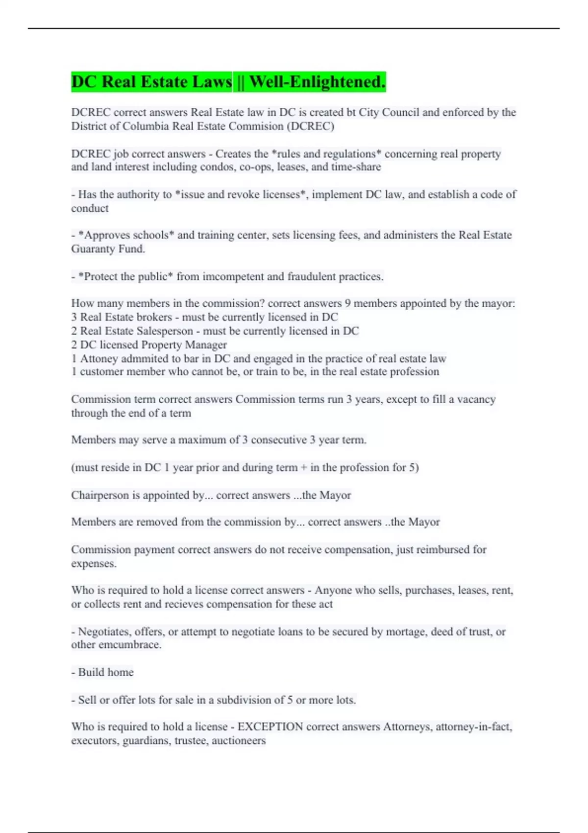 DC Real Estate Exam || Questions with 100% correct answers.