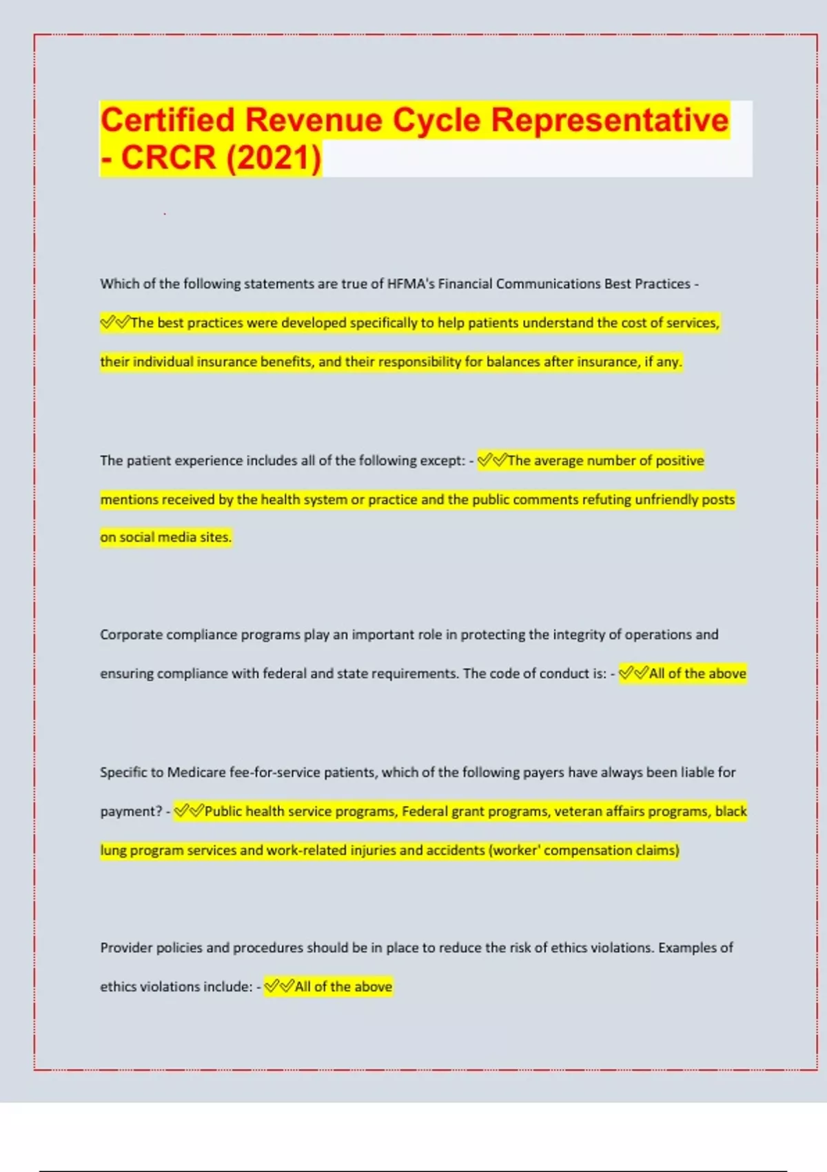 Certified Revenue Cycle Representative - CRCR (2024)| latest update 2024/25|