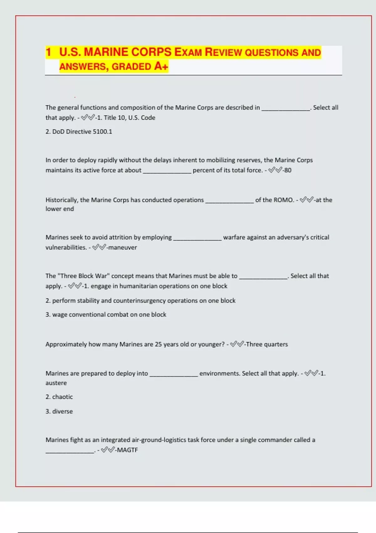 MARINE CORPS EXAM REVIEW QUESTIONS AND ANSWERS, GRADED A+/ VERIFIED/ | latest update 2024/25|