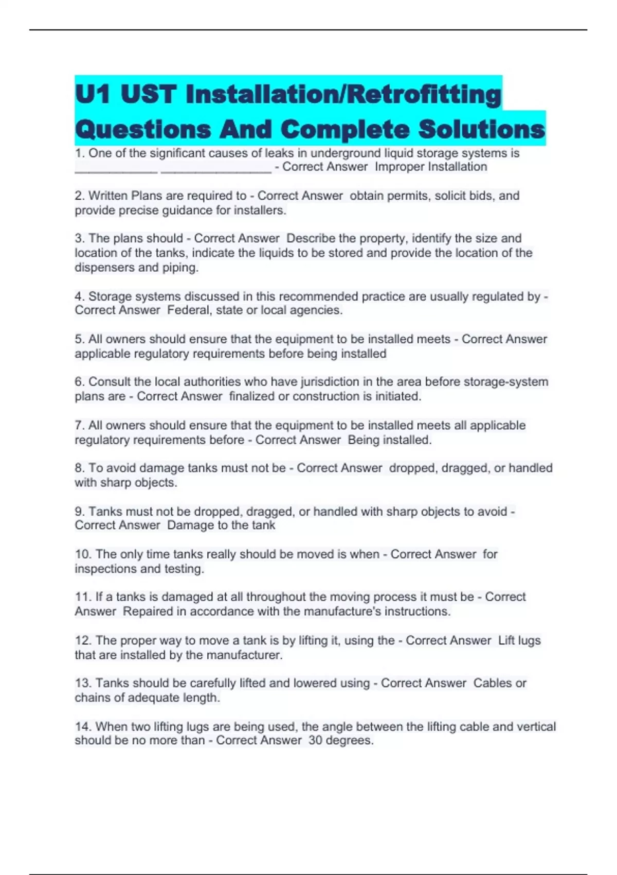 ICC General Requirements Practice Exam With Correct Answers,UST Dates and Frequency California-Updated 2023 Questions (ANSWERED & GRADED),U1 UST Installation/Retrofitting Questions And Complete Solutions,Kentucky UST Certification Test Prep Questions & Answers,UST Test Prep 3 Questions And Answers (Rated A+),UST Inspector Quiz With Correct Answers