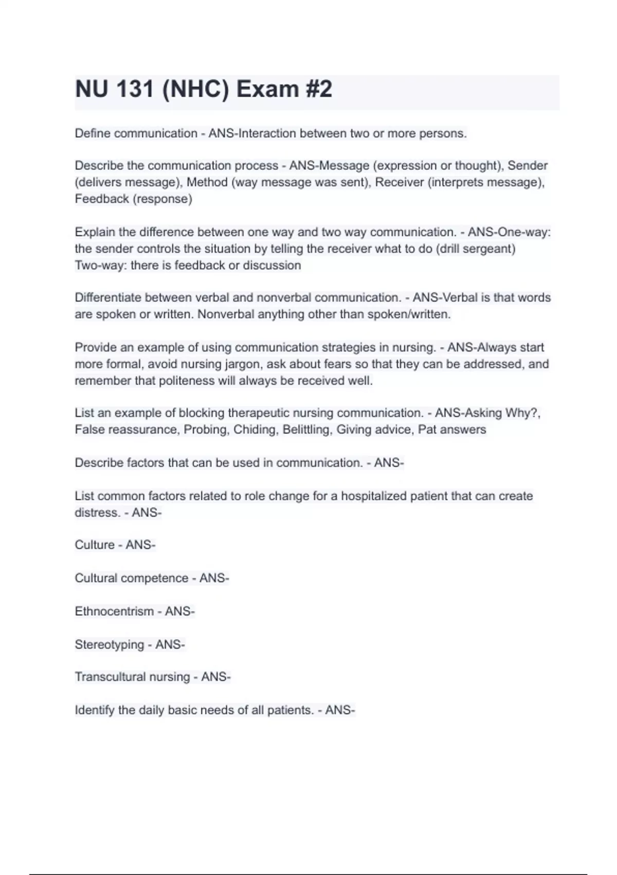 NU 131 (NHC) Exam #2 With complete solution