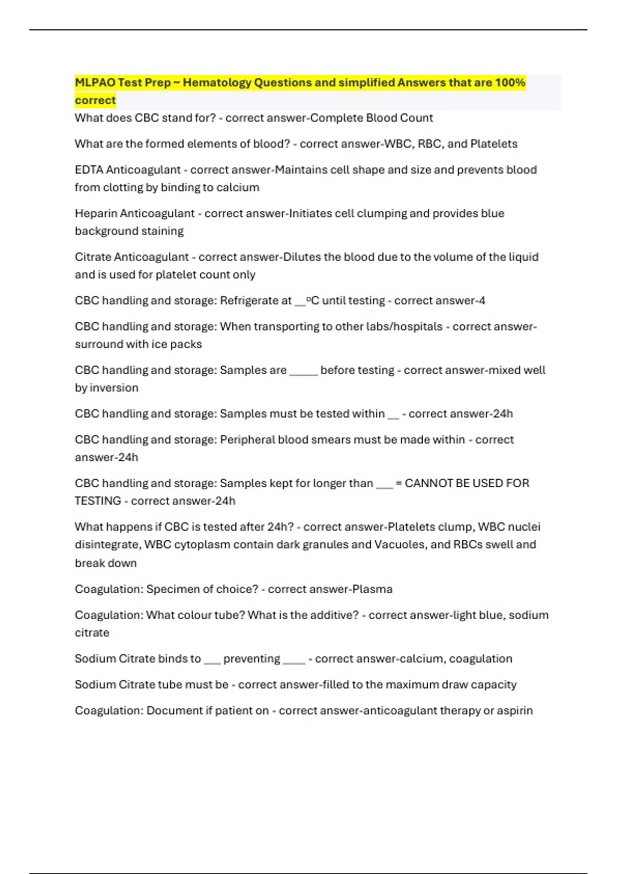 MLPAO Test Prep ~ Hematology Questions and simplified Answers that are 100% correct