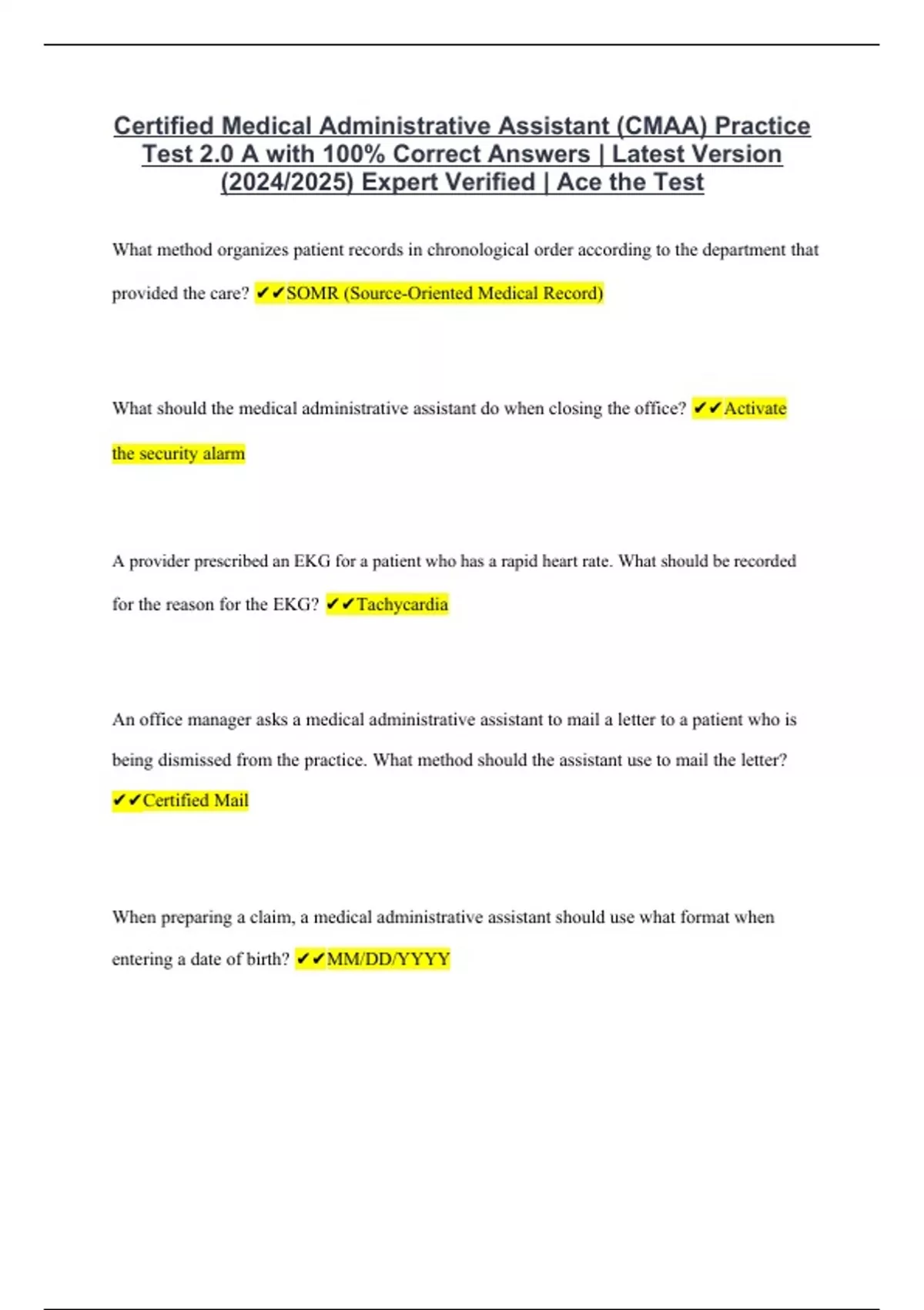 CMAA Questions with 100% Correct Answers | Latest Version (2024/2025) Expert Verified | Ace the Test