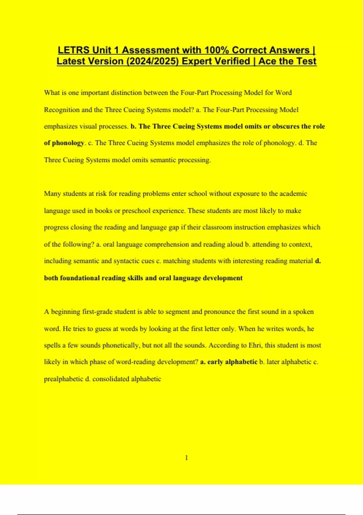 LETRS Unit 1 Assessment with 100% Correct Answers | Latest Version (2024/2025) Expert Verified | Ace the Test