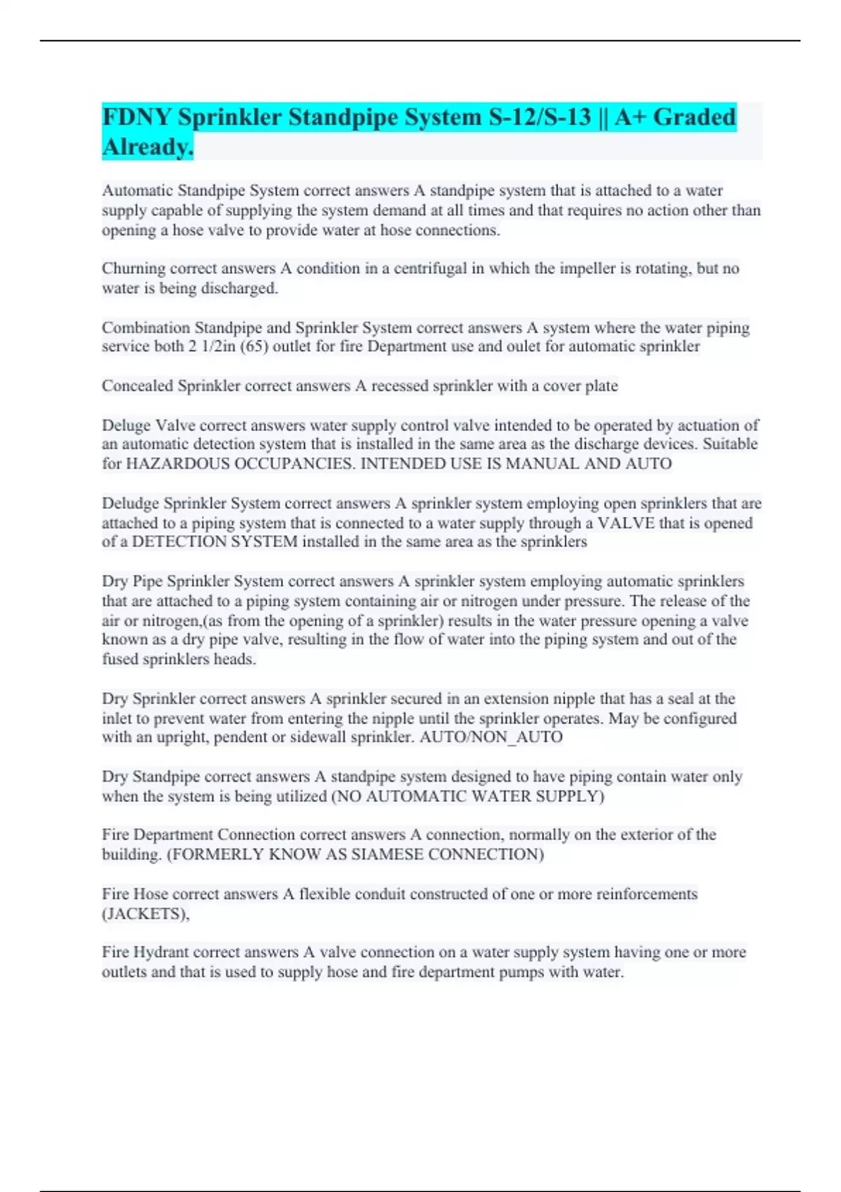 S-12 S-13 Standpipe and Sprinkler Practice Questions || with A+ Guaranteed Solutions. Sprinkler Chart Questions (S12) || A+ Guaranteed. S12 sprinkler test, S13 standpipe test, Sprinklers segment 5, S-12 CITYWIDE SPRINKLER SYSTEMS || All Answers Are Correct 100%. S12 sprinkler test || very Flawless. S12 Certificate of Fitness Sprinkler || with 100%