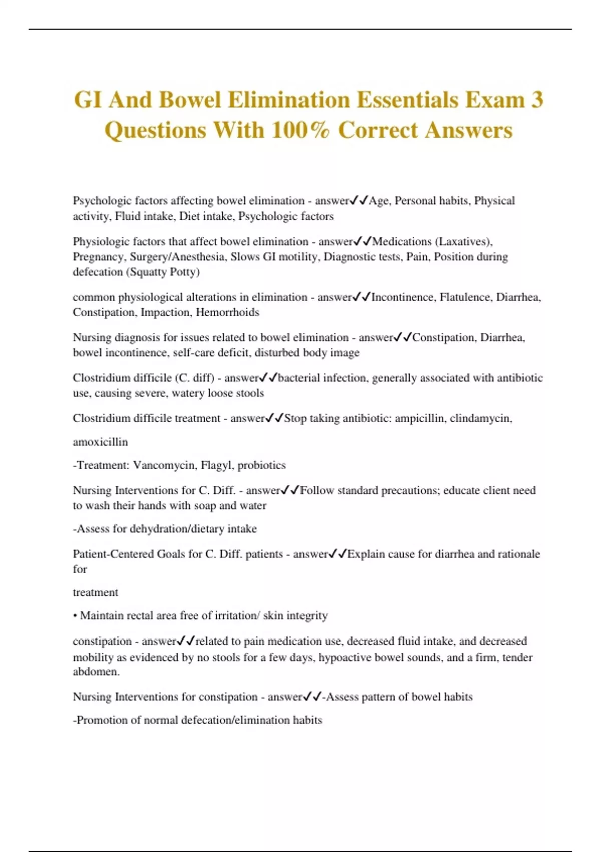 Gastrointestinal (GI) Assessment and Elimination Exam Questions With Verified Answers