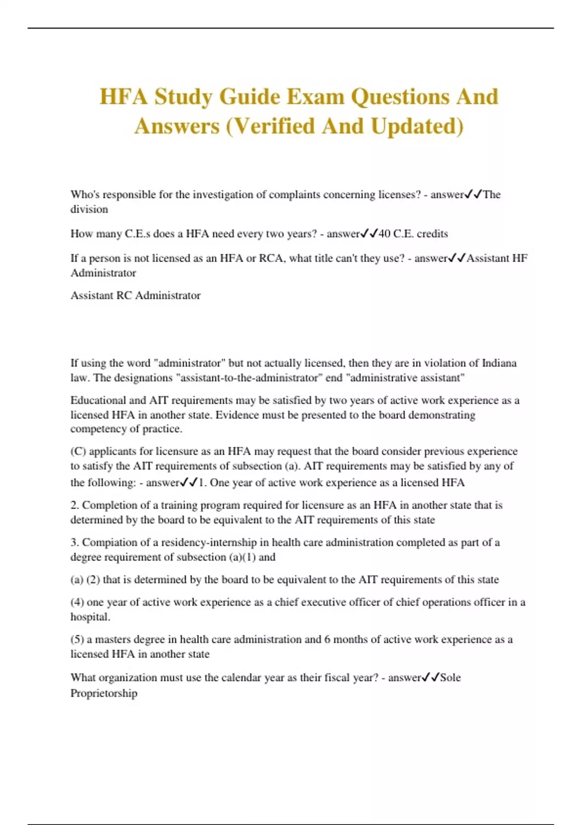 HFA Study Guide Exam Questions And Answers (Verified And Updated)