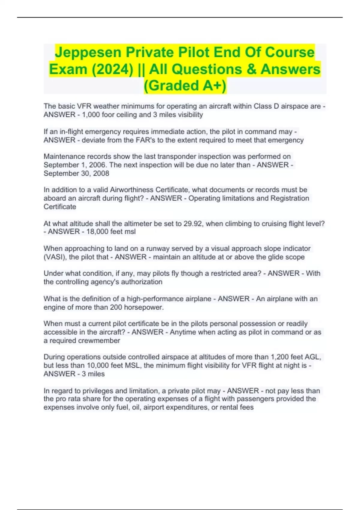 Jeppesen Private Pilot Licensing Comprehensive Test BUNDLE (Package Deal) || With 100% Correct Questions and Solutions || Guaranteed Pass Jeppesen Private Pilot Licensing Comprehensive Test BUNDLE (Package Deal) || With 100% Correct Questions and Solutions || Guaranteed Pass