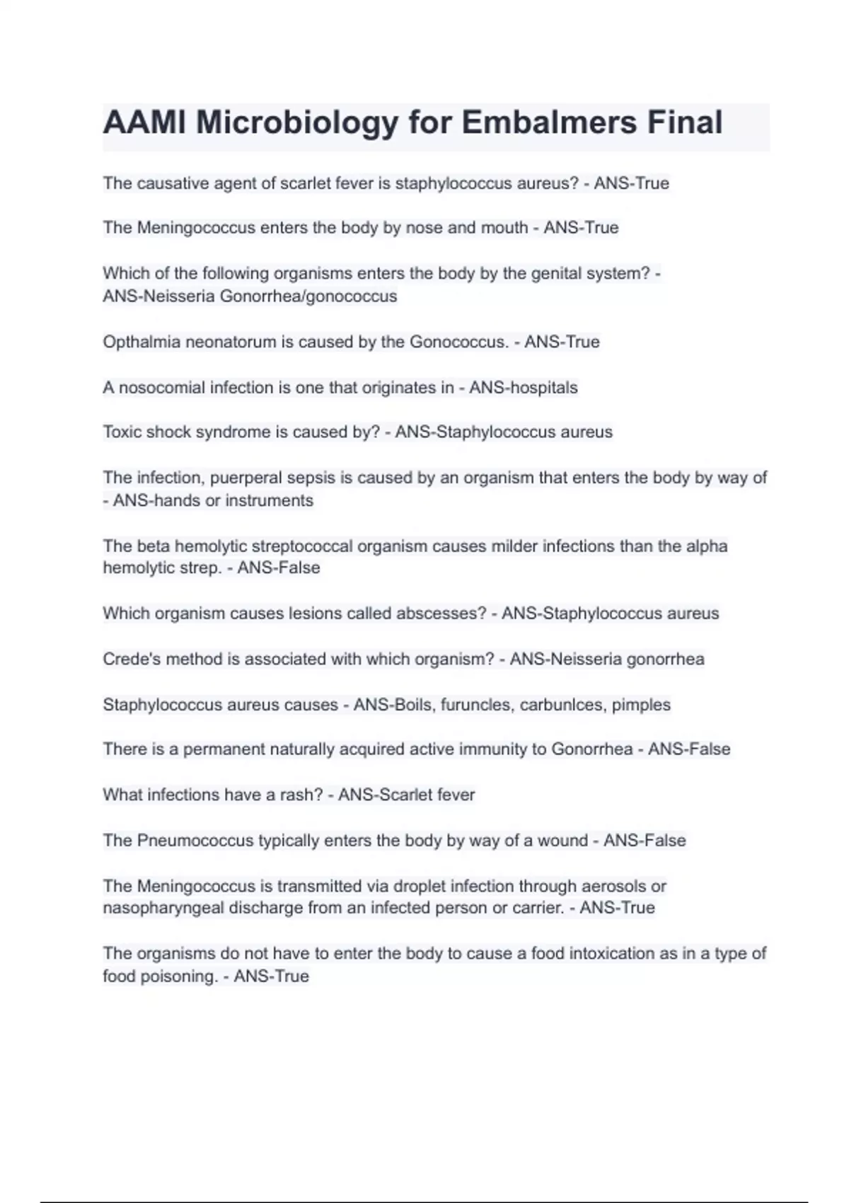 AAMI Microbiology for Embalmers Final Questions & Answers