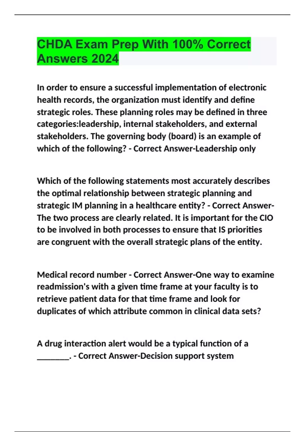 CHDA Exam Questions with 100% Correct Answers | Verified | Latest Update CHDA Exam Prep With 100% Correct Answers 2024 CHDA Practice Exam 2 With 100% Correct Answers 2024 CHDA Domain 1 (Business Needs Assessment) Exam With 100% Correct Answers 2024 CHDA Exam 3 Questions With 100% Correct Answers 2024 CHDA Chapter 1 Exam With 100% Correct Answers
