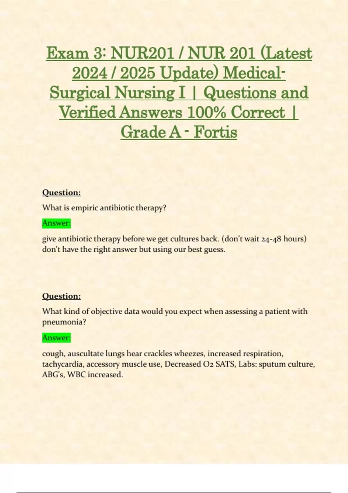 Exam 3 & Exam 4: NUR201 / NUR 201 (Latest 2024 / 2025 Updates STUDY BUNDLE WITH COMPLETE SOLUTIONS) Medical-Surgical Nursing I | Questions and Verified Answers | 100% Correct | Grade A – Fortis