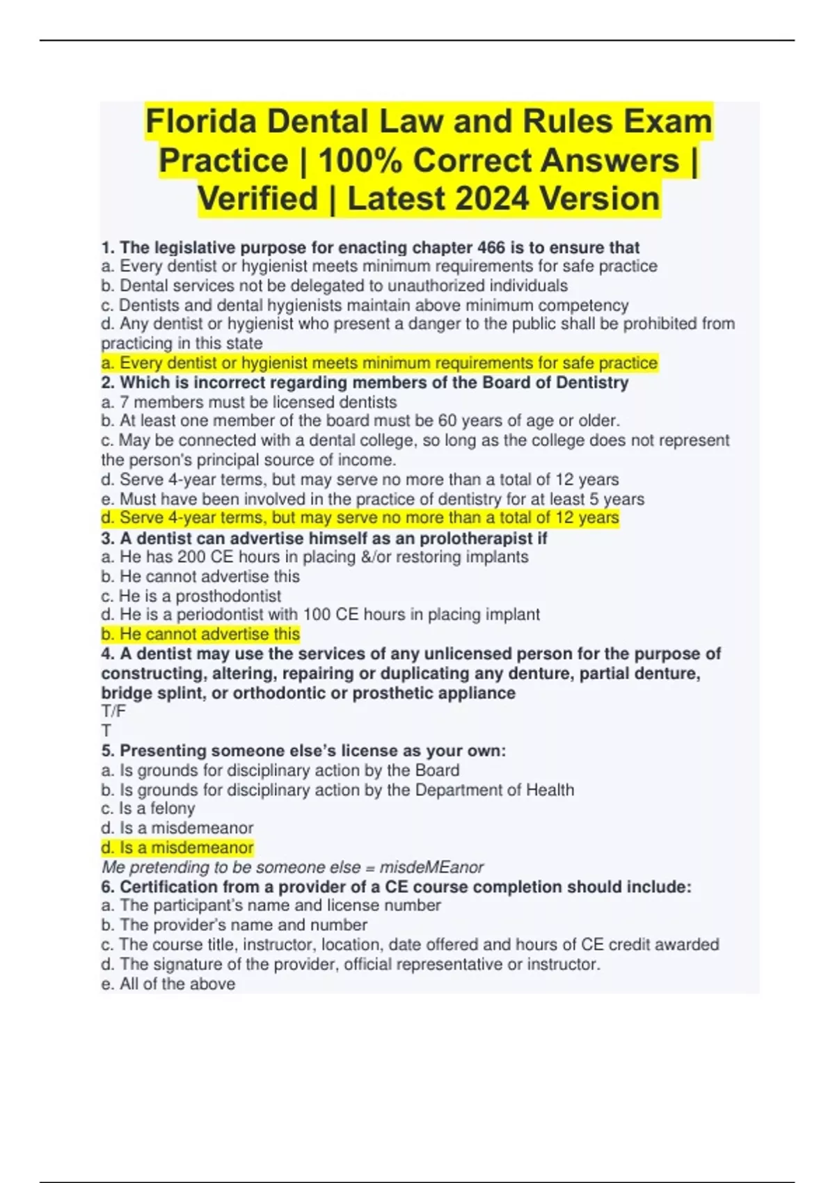 Florida Dental Law Bundled Exams Questions & Answers Latest Versions (2024/2025) Already Passed