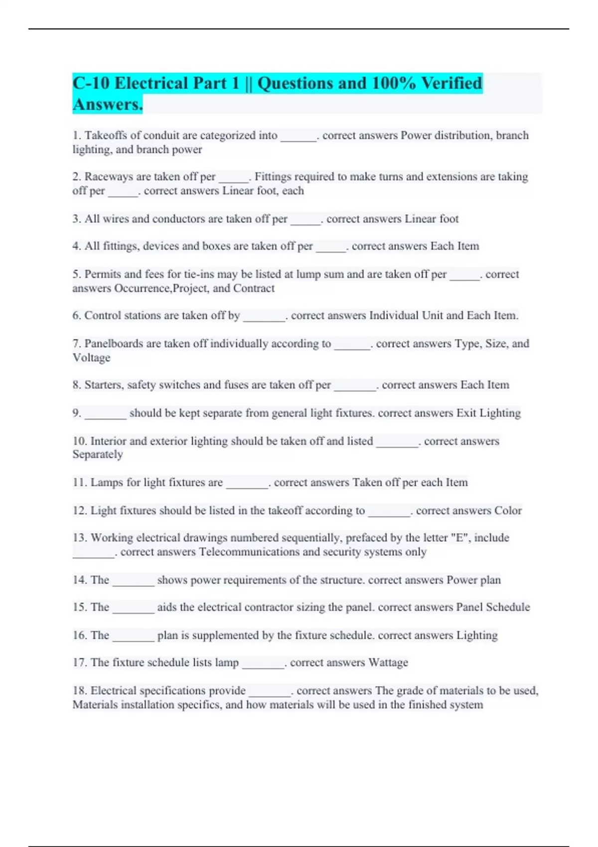 DT C10 ELECTRICAL || Already Graded A+. Safety - California Contractors (Law and Business) || A Verified A+ Pass. Electrical Contractor s License || Already Passed. Sample questions from all CSLB trade exams || with Errorless Solutions 100%. Electrical C-10 Contractors License || with 100% Error-free Solutions. C-10 Electrical Part 1 || Questions a
