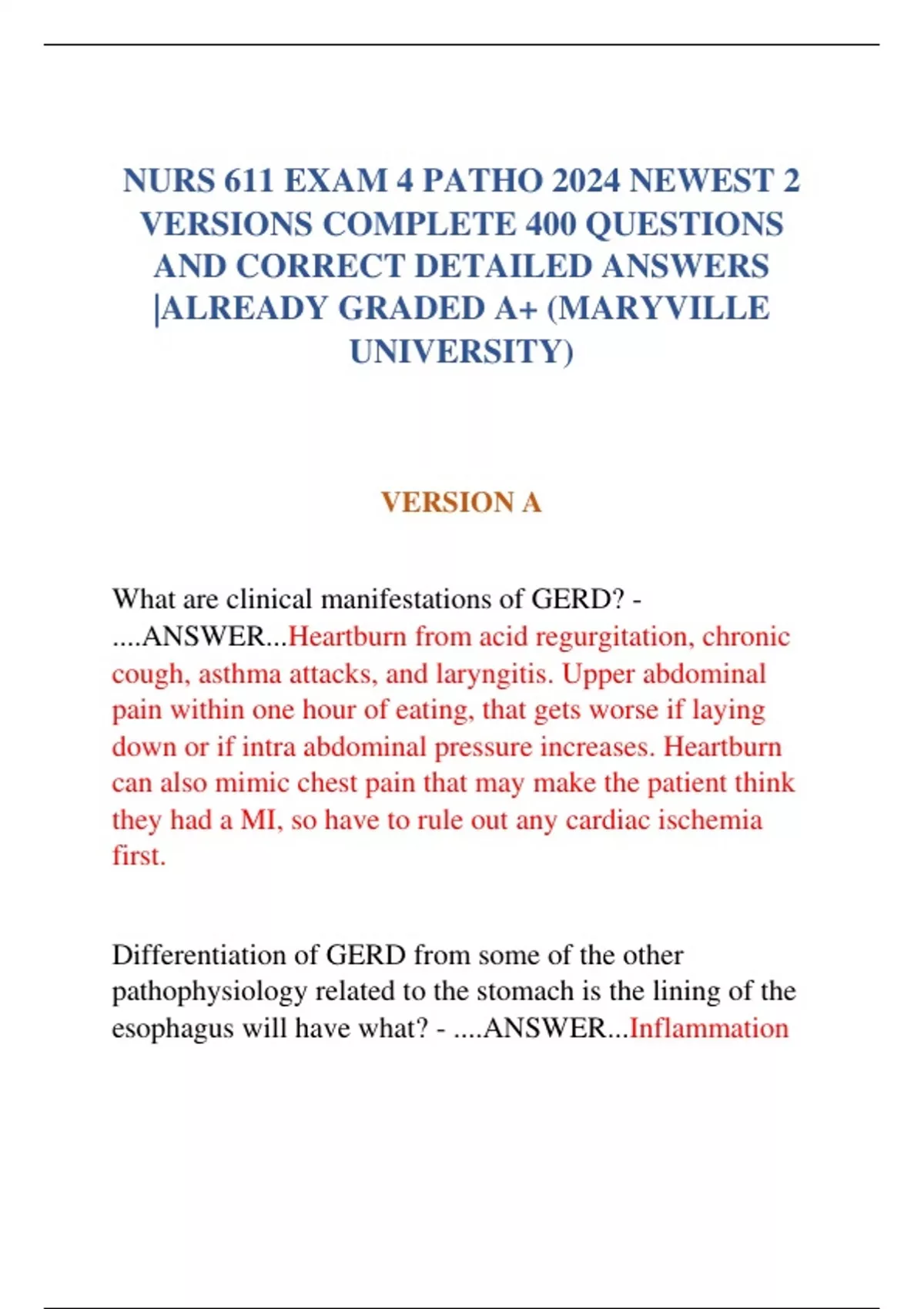 NURS 611 EXAM 4 PATHO 2024 NEWEST 2 VERSIONS COMPLETE 400 QUESTIONS AND CORRECT DETAILED ANSWERS |ALREADY GRADED A+ (MARYVILLE UNIVERSITY)