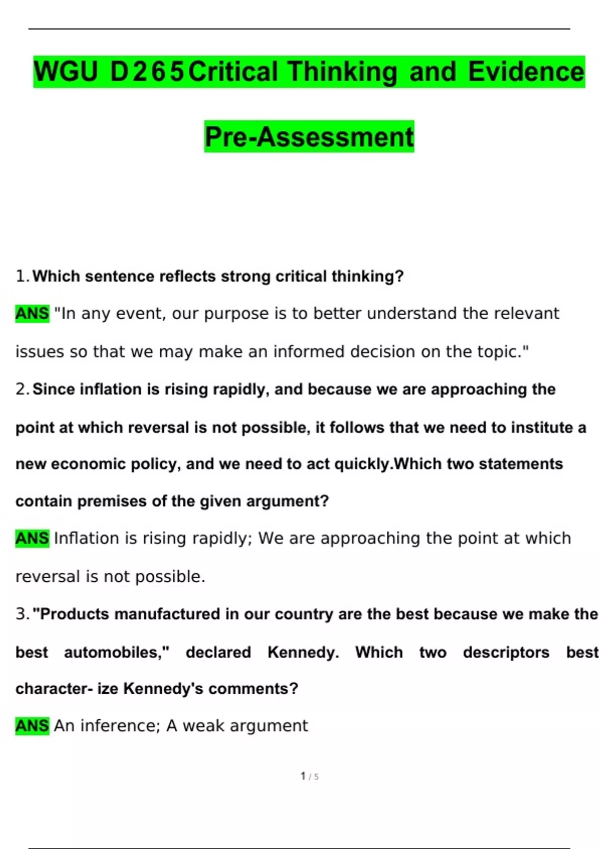 WGU D265 Critical Thinking BUNDLED WGU D265 CRITICAL THINKING REASON AND EVIDENCE OBJECTIVE ASSESSMENT EXAM LATEST 2024 QUESTIONS AND CORRECT ANSWERS