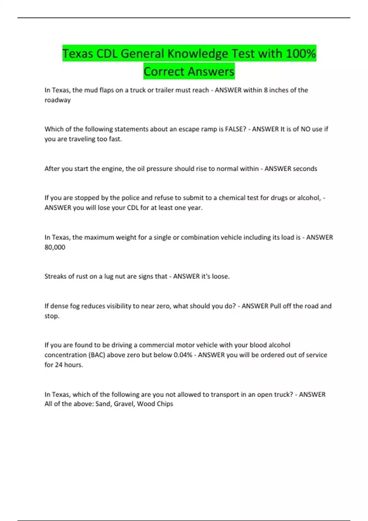 Texas CDL General Knowledge Test with 100% Correct Answers