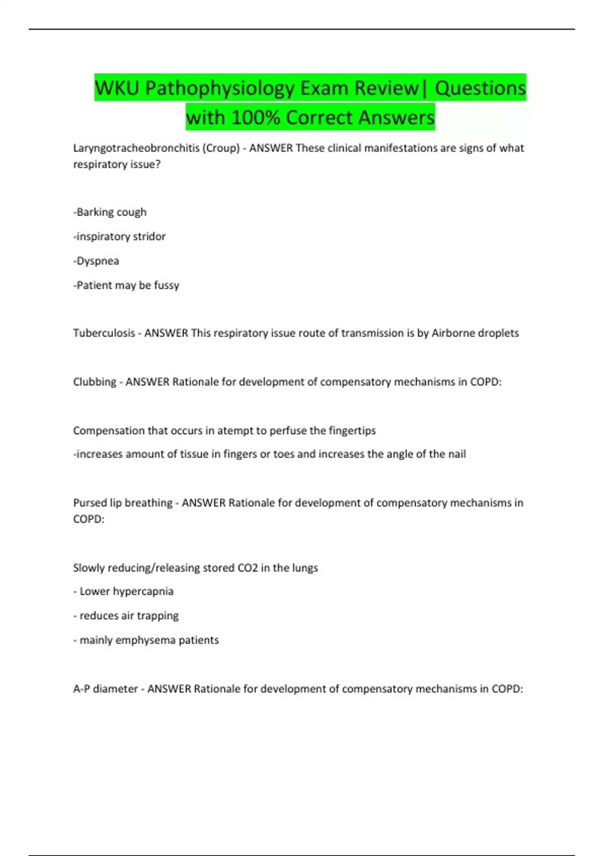 WKU Pathophysiology EXAMS BUNDLE| Questions with Complete Solutions |Latest Update Questions