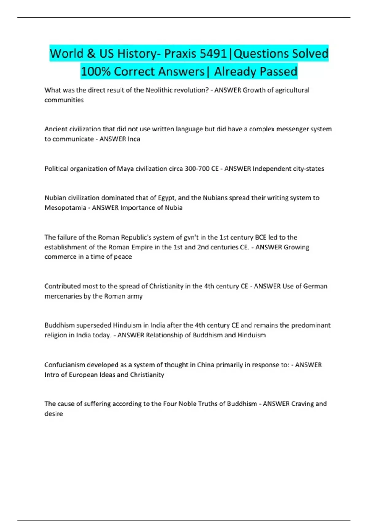 Praxis World and Us History Exam |Questions Solved 100% Correct Answers| Already Passed