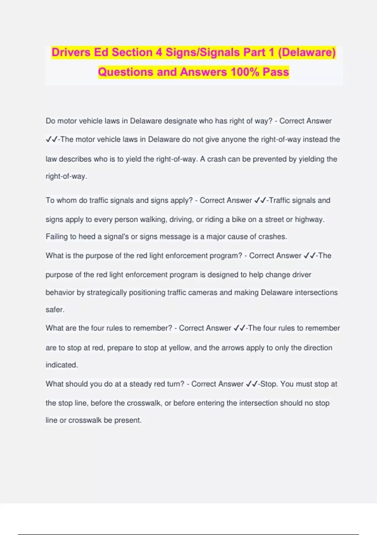 Delaware Driver's Ed. Final Exam Questions and Answers 100% Pass