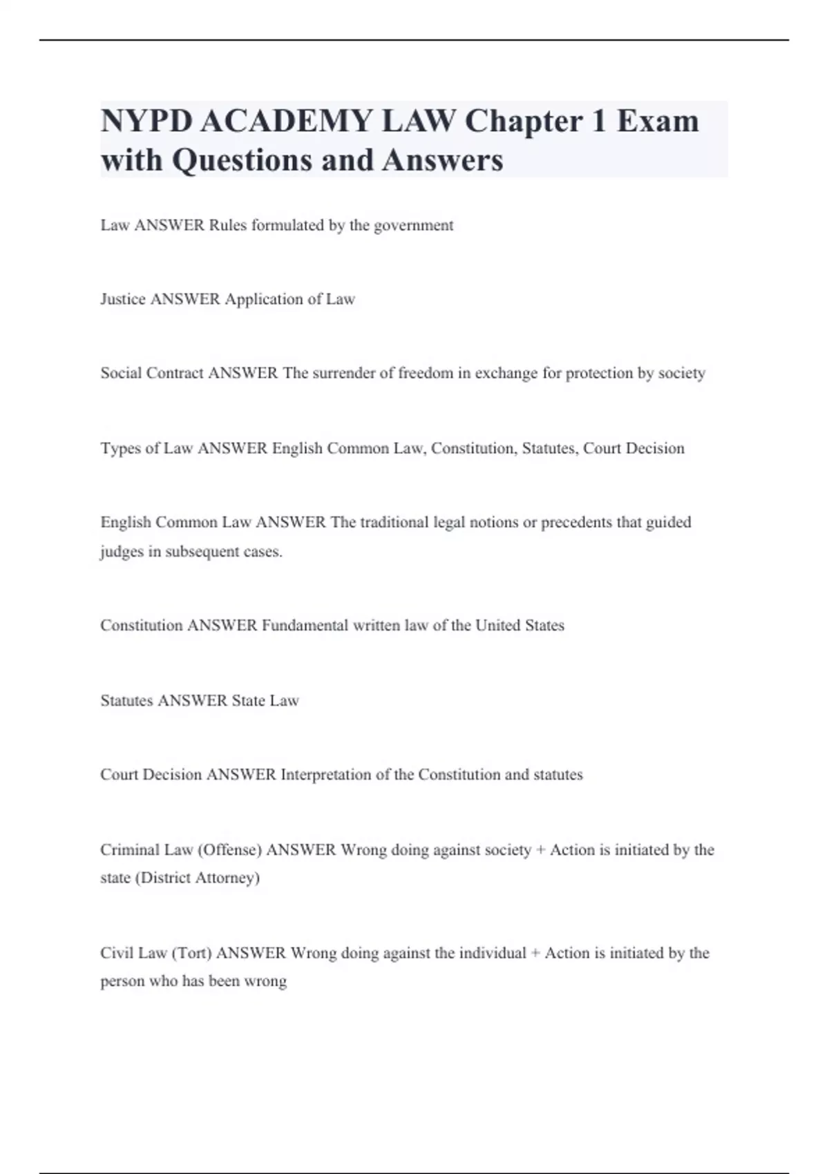 Package deal for NYPD ACADEMY LAW Chapter 1 Exam with Questions and Answers