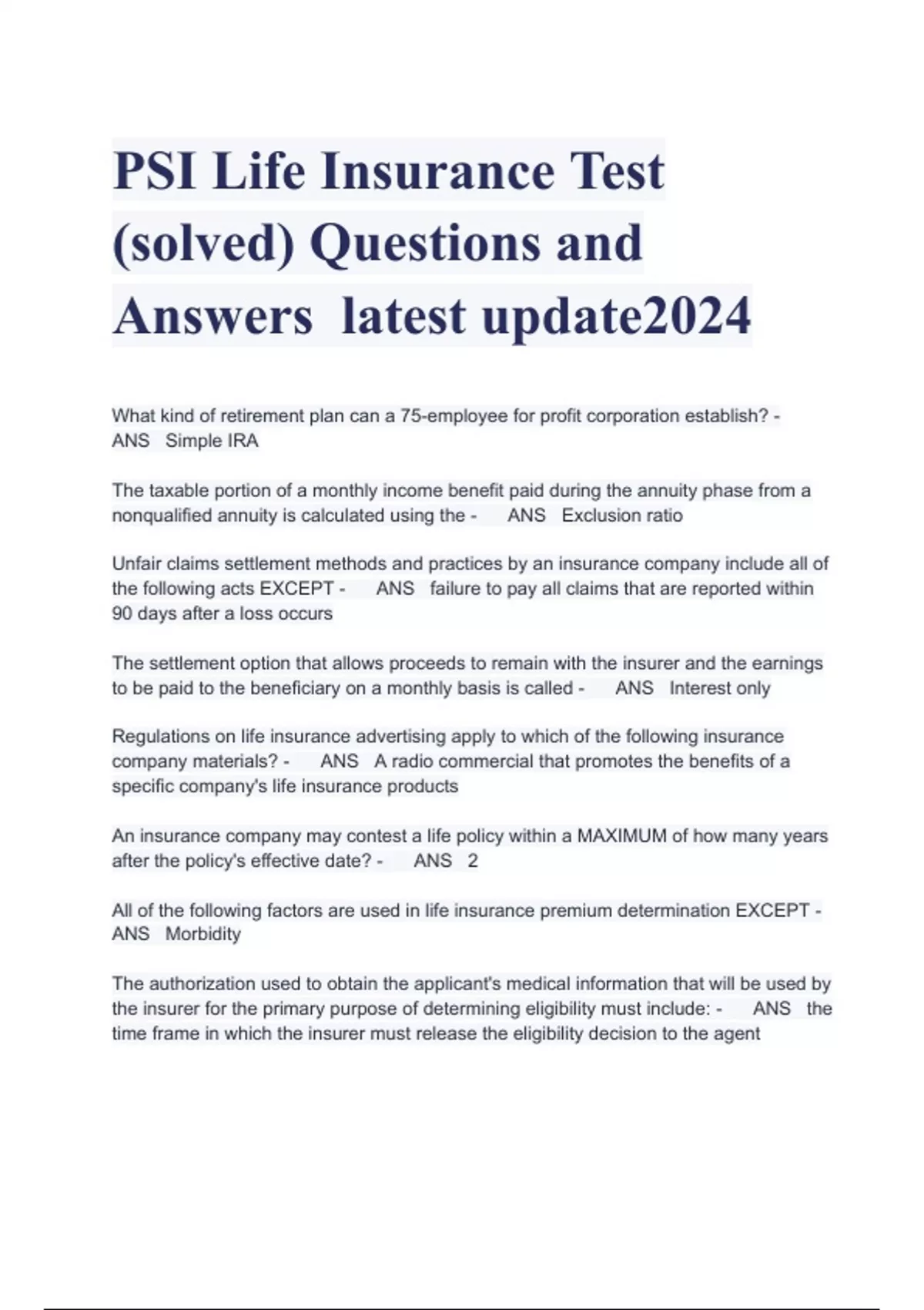 PSI Insurance Exam CORRECTLY SOLVED LATEST QUESTIONS AND VERIFIED ANSWERS