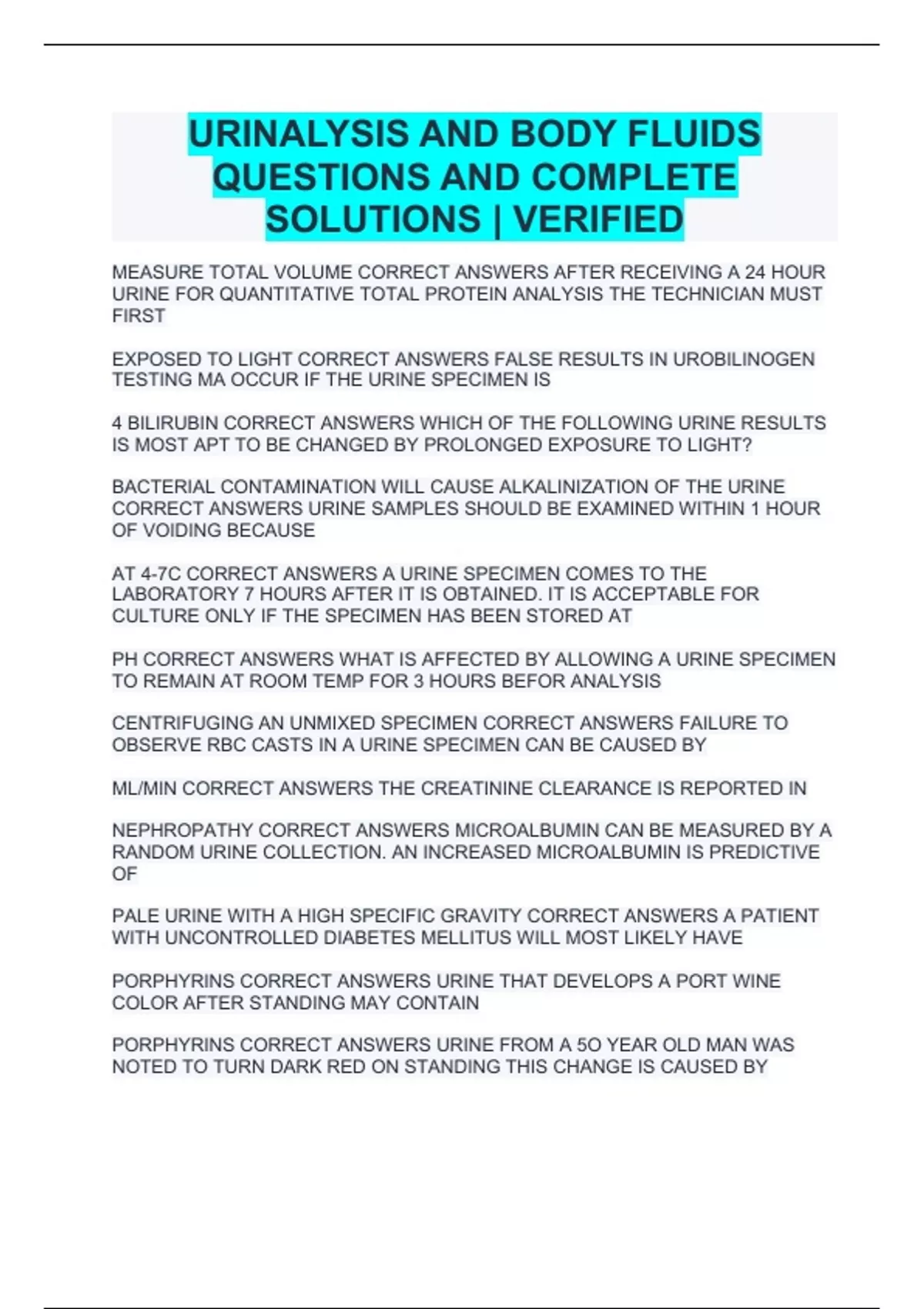 URINALYSIS AND BODY FLUIDS QUESTIONS AND COMPLETE SOLUTIONS | VERIFIED Urine & Body Fluid Analysis Exam 1 With 100% Correct Answers Urinalysis and Body Fluids Questions And Answers Solved 100% Correct!!!