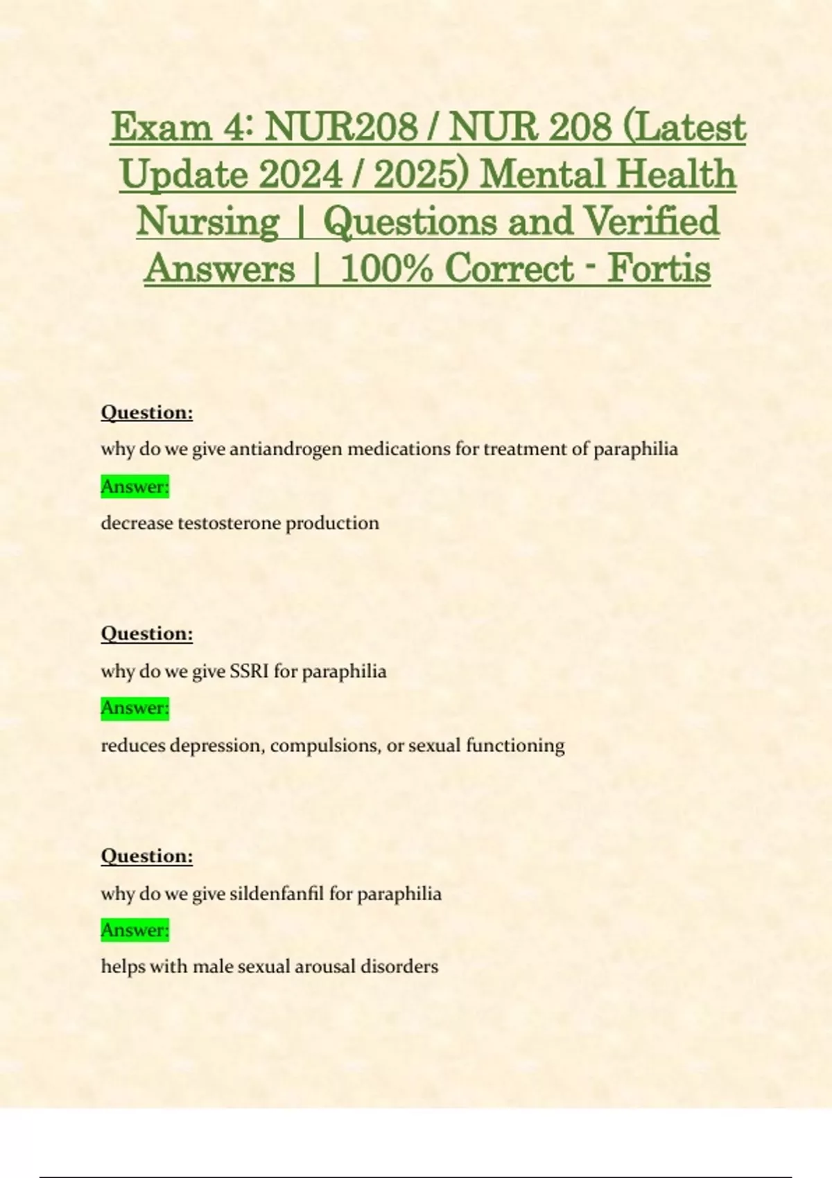 Exam 4: NUR208 / NUR 208 (Latest 2024 / 2025 Updates STUDY BUNDLE WITH COMPLETE SOLUTIONS) Mental Health Nursing | Questions and Verified Answers | 100% Correct | Grade A – Fortis