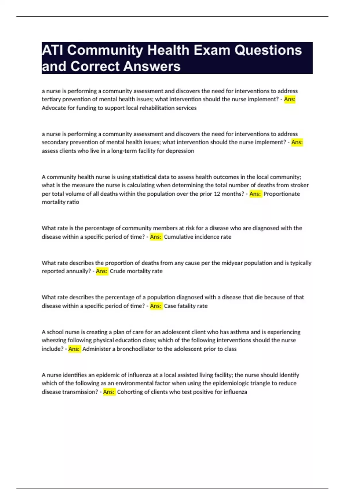 ATI Proctored Exam Community Health (Public Health) Questions and Correct Answers Bundle Compilation Graded A+