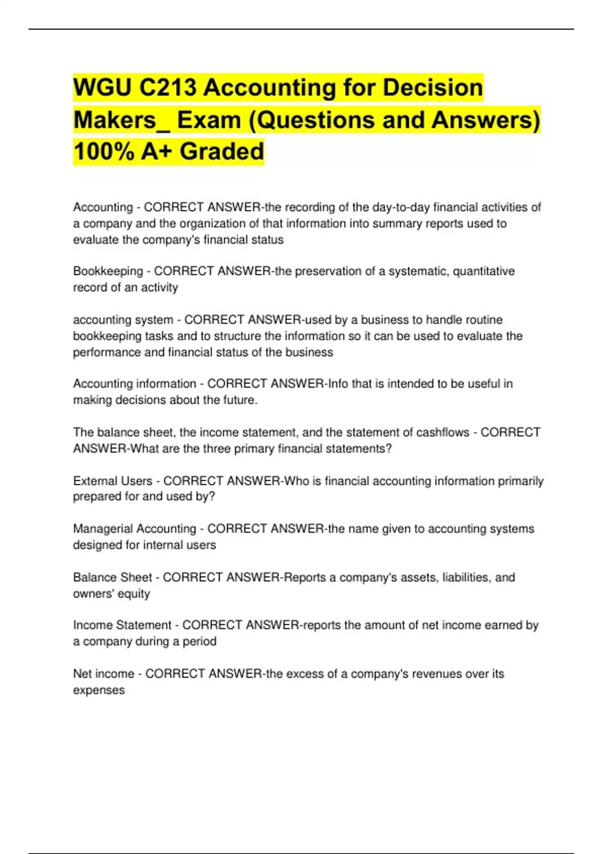 C213 Test Questions and Answers Well Prepared For Excel in Exam Exam (elaborations) WGU C213 Accounting for Decision Makers_ Exam (Questions and Answers) 100% A+ Graded Package Deal 100% A+ Graded