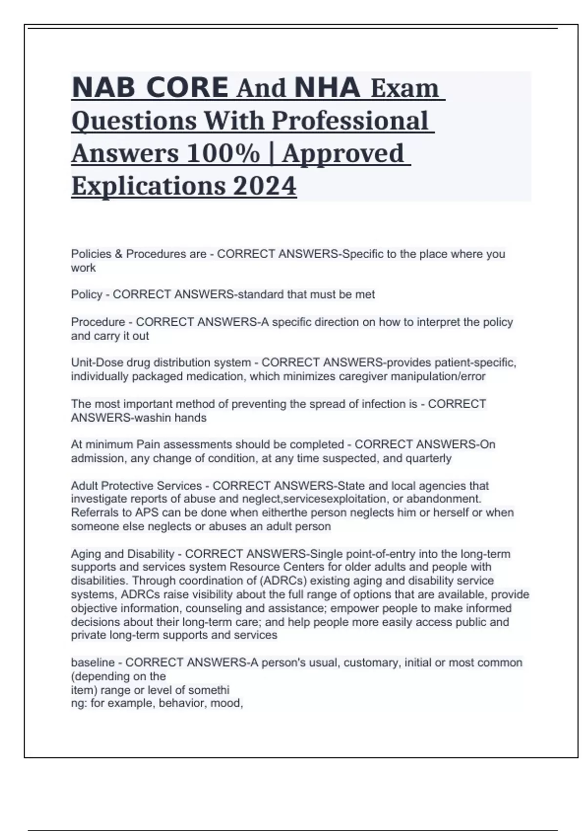NAB CORE And NHA Exam Questions With Professional Answers 100% | Approved Explications 2024 NAB CORE RCAL LEADERSHIP Exam Questions With Professional Answers 100% | Approved Explications 2024NAB Core Practice Exam With 110 Questions And Professional Answers 100% | Approved Explications 2024 NAB Core Practice Exam With 110 Questions And Professiona