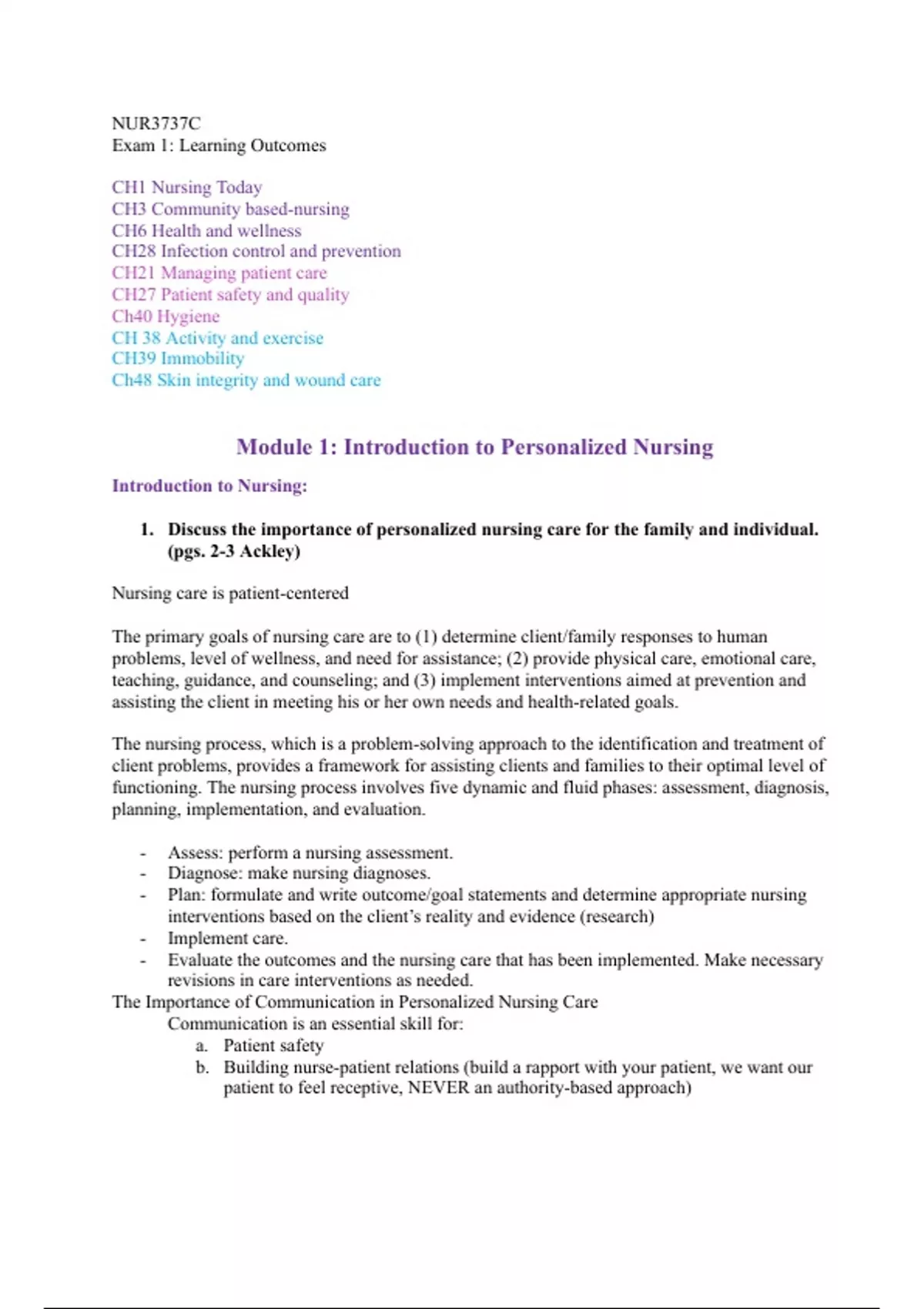 This package deal comes with study guides for exams 1-3 to help condense the information of all the exams. Nursing school is already overwhelming with all the chapters that are assigned. Why not reduce the time to help you focus on the important concepts? This study guide includes class notes and textbook notes.