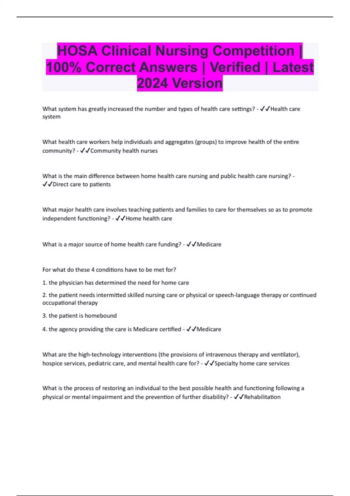 HOSA Home Health Aide | 100% Correct Answers | Verified | Latest 2024 Version
