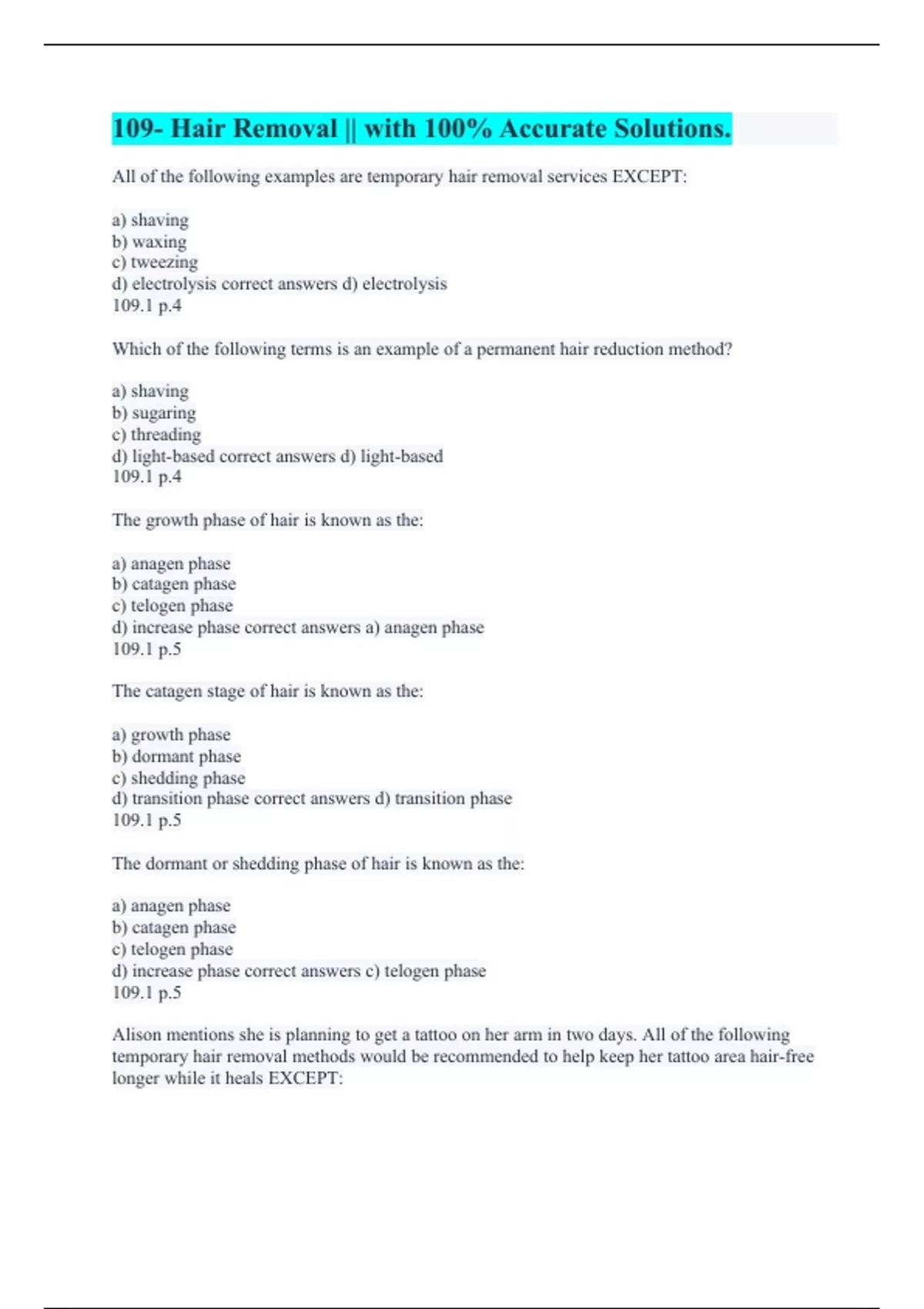 Hair Removal || with 100% Errorless Solutions. MILADY HAIR REMOVAL || A VERIFIED A+ PASS. Milady Chapter 22 Practice Test (Hair Removal) || All Questions Answered Correctly. LASER HAIR REMOVAL || with 100% Error-free Solutions. Laser Hair Removal || with Error-free Solutions. Hair Removal || Already Graded A+. Hair removal theory || A+ Graded Alrea