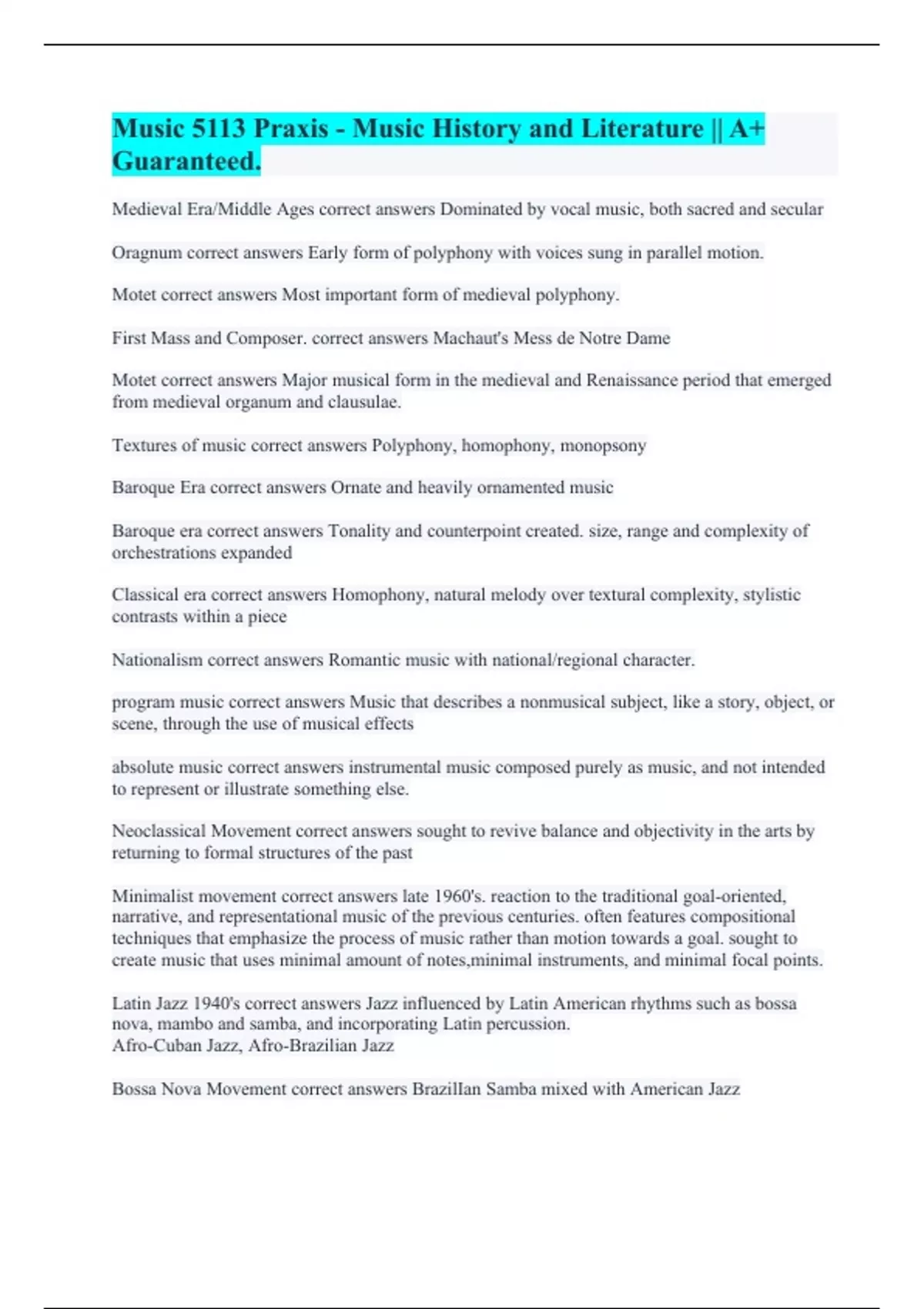 Music Content Knowledge 5113 || with 100% Correct Answers. Praxis Music 5113: pedagogy and technology || with Accurate Answers 100%. Praxis 5113 || A+ Graded Already. Praxis 5113 World Music || with 100% Error-free Answers. Praxis 5113 Theory and Composition || with 100% Errorless Solutions. Praxis 5113 Questions || Already Passed. Praxis 5113 Perf