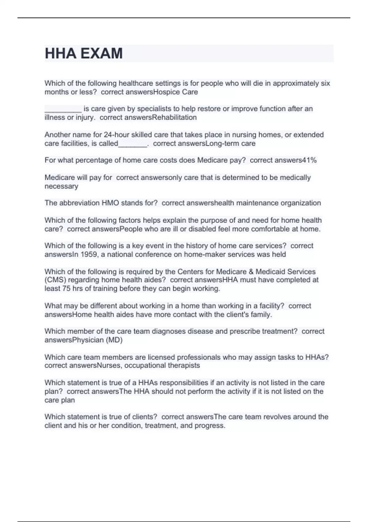 HHA Exam with perfect solutions 2024 HHA FINAL with perfect answers 2024