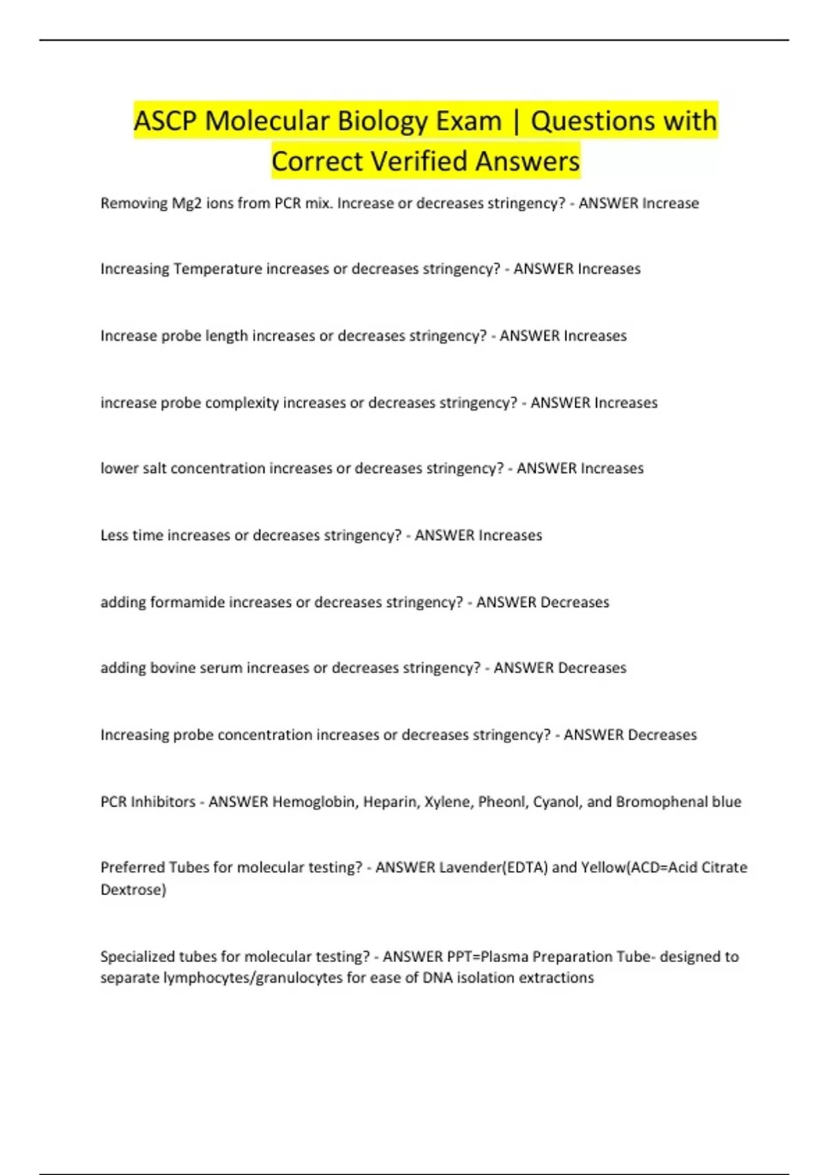 ASCP Molecular Biology Exam Study Questions with Correct Verified Answers
