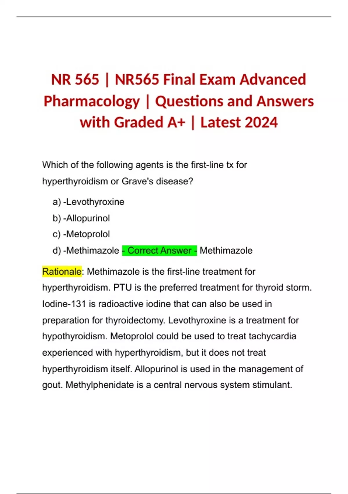 NR 565 | NR565 Final Exam Advanced Pharmacology | Questions and Answers with Rationale Graded A+ | Latest 2024