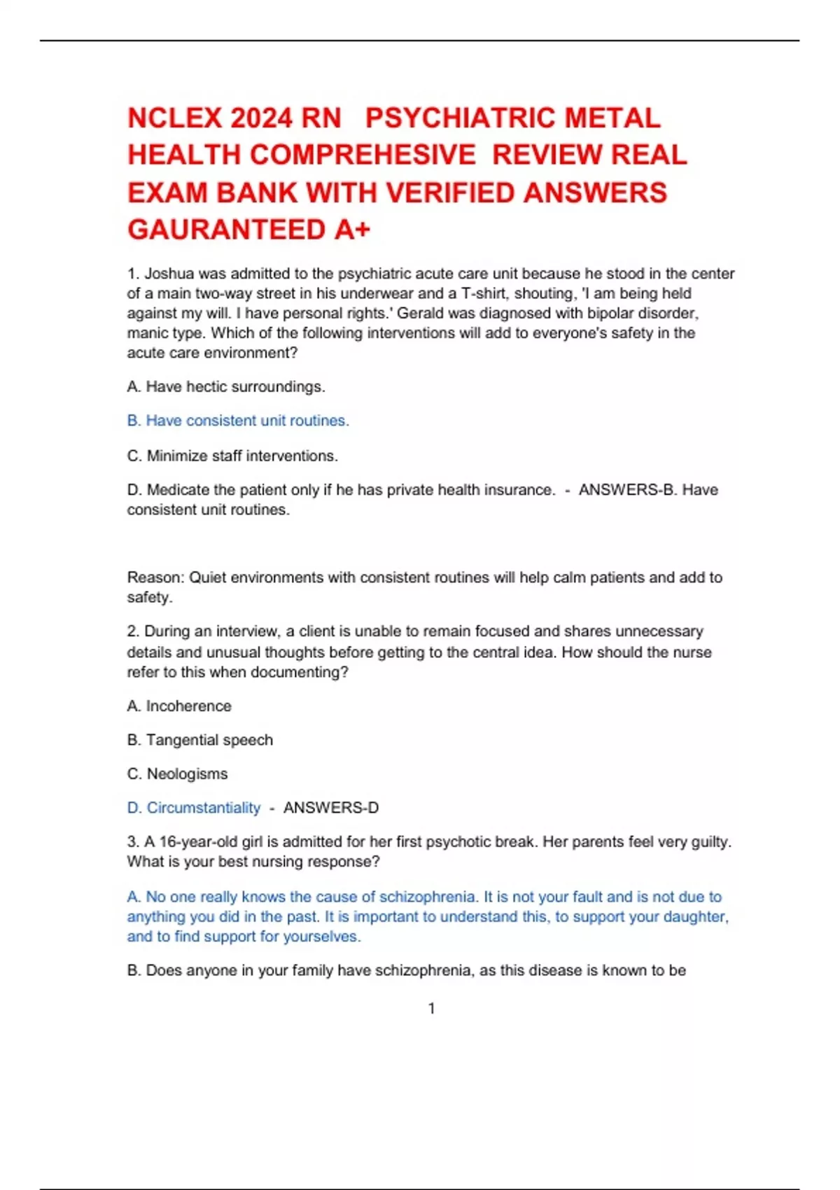 NCLEX 2024 RN PSYCHIATRIC METAL HEALTH COMPREHESIVE REVIEW REAL EXAM BANK WITH VERIFIED ANSWERS GAURANTEED A+