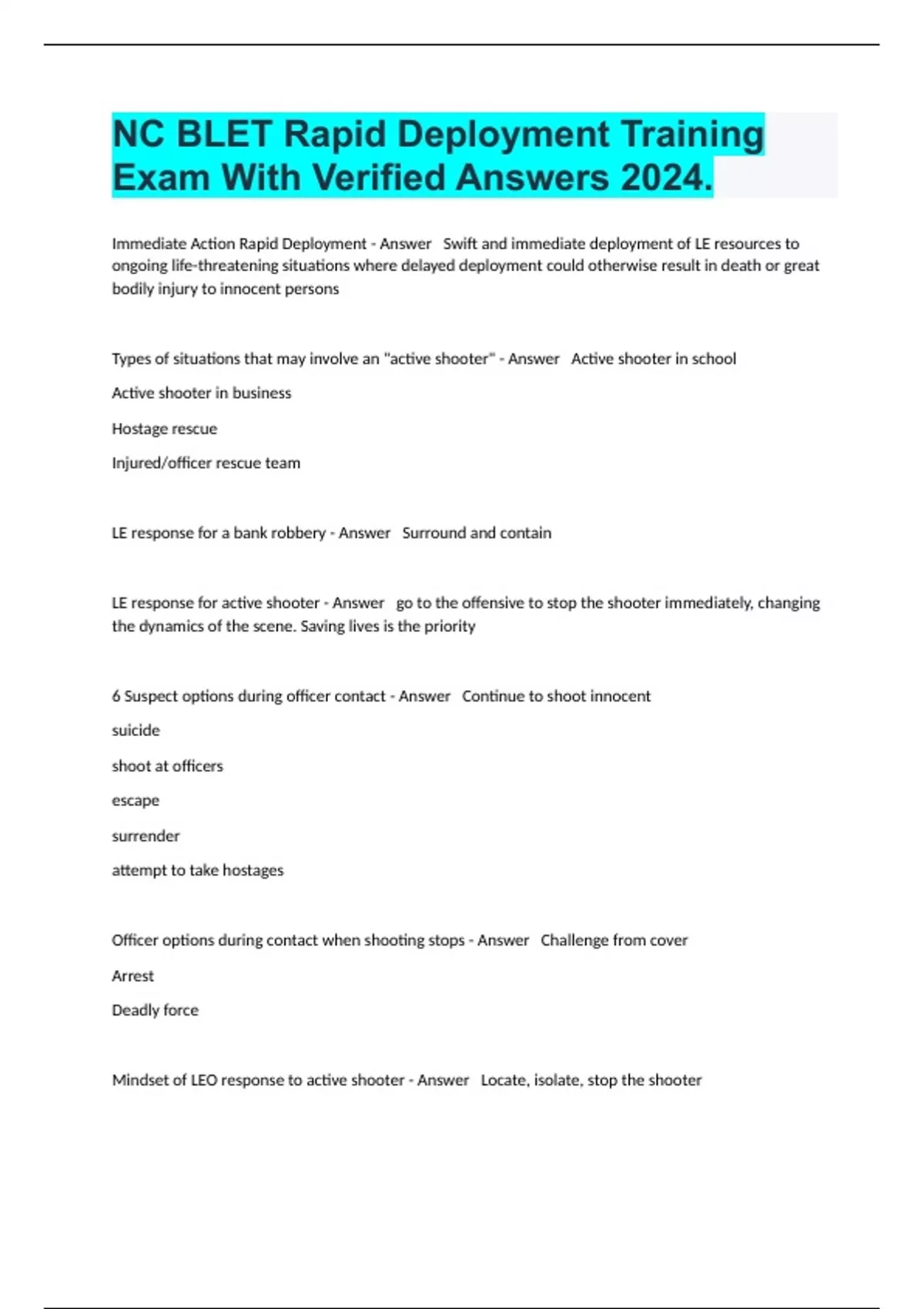 1 Exam (elaborations) NC BLET Comprehensive Exam And Answers Already Passed 2024. 2 Exam (elaborations) Nc Blet Controlled Substances Latest Exam Well Answered 100% 2024. 3 Exam (elaborations) NC BLET Court Duties License Exam With Complete Answers 2024.