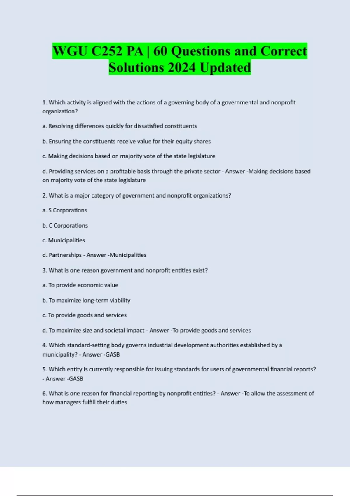 Bundle for WGU C252 Questions and Correct Solutions 2024 | 2025. Actual tests, Governmental Accounting, Nonprofit Accounting, chapters 4,5,6,7,8,9,10,11,12, Practice tests