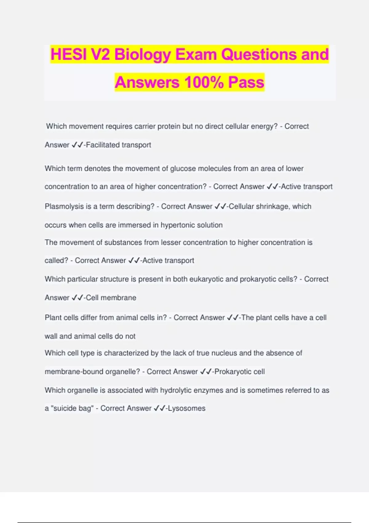 HESI V2 Biology Exam Questions and Answers 100% Pass